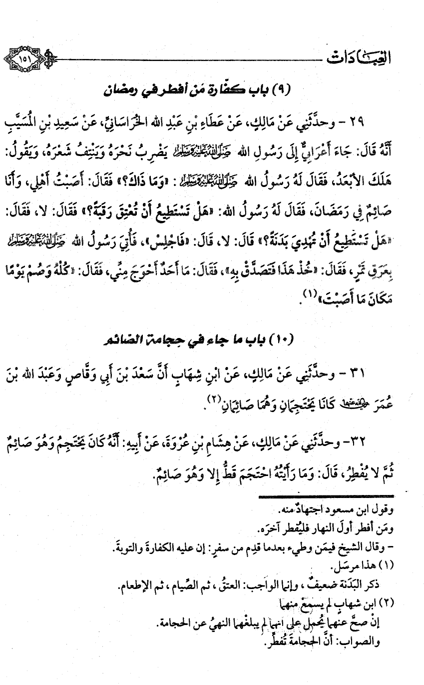 31 - وحدثني عن مالك، عن ابن شهاب أن سعد بن أبي وقاص وعبد الله بن عمر - رضي الله عنه - كانا يحتجمان وهما صائمان (¬2).