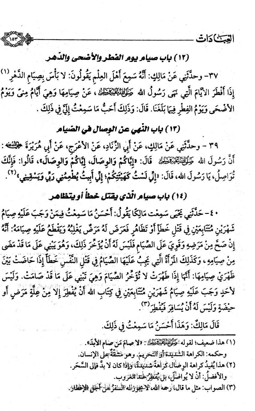 39 - وحدثني عن مالك، عن أبي الزناد، عن الأعرج، عن أبي هريرة - رضي الله عنه -: أن رسول الله - صلى الله عليه وسلم - قال: «إياكم والوصال، إياكم والوصال»، قالوا: فإنك تواصل، يا رسول الله، قال: «إني لست كهيئتكم؛ إني أبيت يطعمني ربي ويسقيني» (¬2).