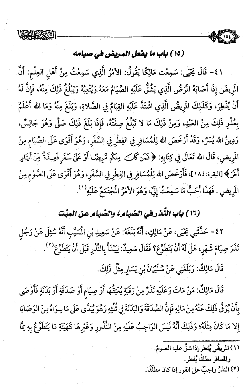 41 - قال يحيى: سمعت مالكًا يقول: الأمر الذي سمعت من أهل العلم: أن المريض إذا أصابه المرض الذي يشق عليه الصيام معه ويتعبه ويبلغ ذلك منه، فإن له أن يفطر، وكذلك المريض الذي اشتد عليه القيام في الصلاة، وبلغ منه وما الله أعلم بعذر ذلك من العبد، ومن ذلك ما لا تبلغ صفته، فإذا بلغ ذلك صلى وهو جالس، ودين الله يسر، وقد أرخص الله للمسافر في الفطر في السفر، وهو أقوى على الصيام من المريض، قال الله تعالى في كتابه: {فَمَنْ كَانَ مِنْكُمْ مَرِيضًا أَوْ عَلَى سَفَرٍ فَعِدَّةٌ مِنْ أَيَّامٍ أُخَرَ} [البقرة: 184]، فأرخص الله للمسافر في الفطر في السفر، وهو أقوى على الصوم من المريض. فهذا أحب ما سمعت إلي، وهو الأمر المجتمع عليه (¬1).