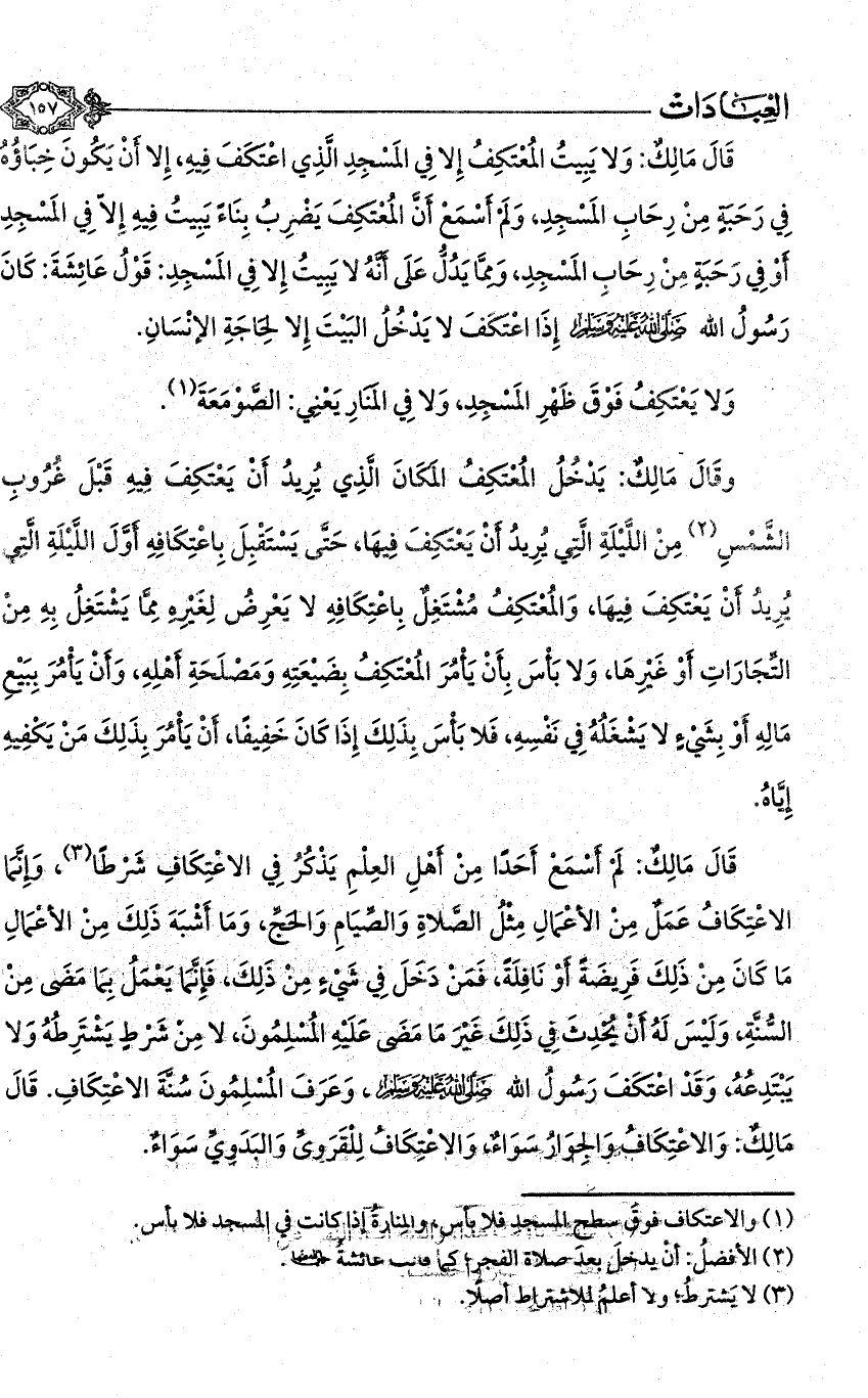 قال مالك: لم يسمع أحدًا من أهل العلم يذكر في الاعتكاف شرطًا (¬3)، وإنما الاعتكاف عمل من الأعمال مثل الصلاة والصيام والحج، وما أشبه ذلك من الأعمال ما كان من ذلك فريضة أو نافلة، فمن دخل في شيء من ذلك، فإنما يعمل بما مضى من السنة، وليس له أن يحدث في ذلك غير ما مضى عليه المسلمون، لا من شرط يشترطه ولا يبتدعه، وقد اعتكف رسول الله - صلى الله عليه وسلم -، وعرف المسلمون سنة الاعتكاف. قال مالك: والاعتكاف والجوار سواء، والاعتكاف للقروي والبدوي سواء.