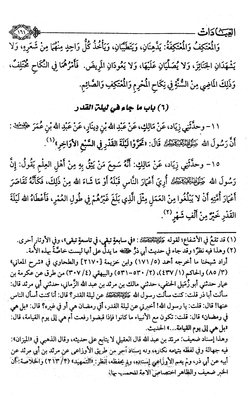 15 - وحدثني زياد، عن مالك: أنه سمع من يثق به أهل العلم يقول: إن رسول الله - صلى الله عليه وسلم - أري أعمار الناس قبله أو ما شاء الله من ذلك، فكأنه تقاصر أعمار أمته أن لا يبلغوا من العمل مثل الذي بلغ غيرهم في طول العمر، فأعطاه الله ليلة القدر خير من ألف شهر (¬2).