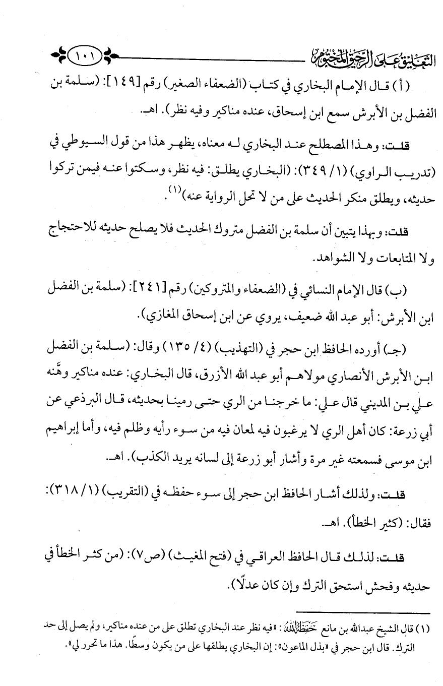 (¬1) قال الشيخ عبد الله بن مانع - حفظه الله -: (فيه نظر عند البخاري تطلق على من عنده مناكير، ولم يصل إلى حد الترك. قال ابن حجر في بذل الماعون: إن البخاري يطلقها على من يكون وسطا. هذا ما تحرر لي).