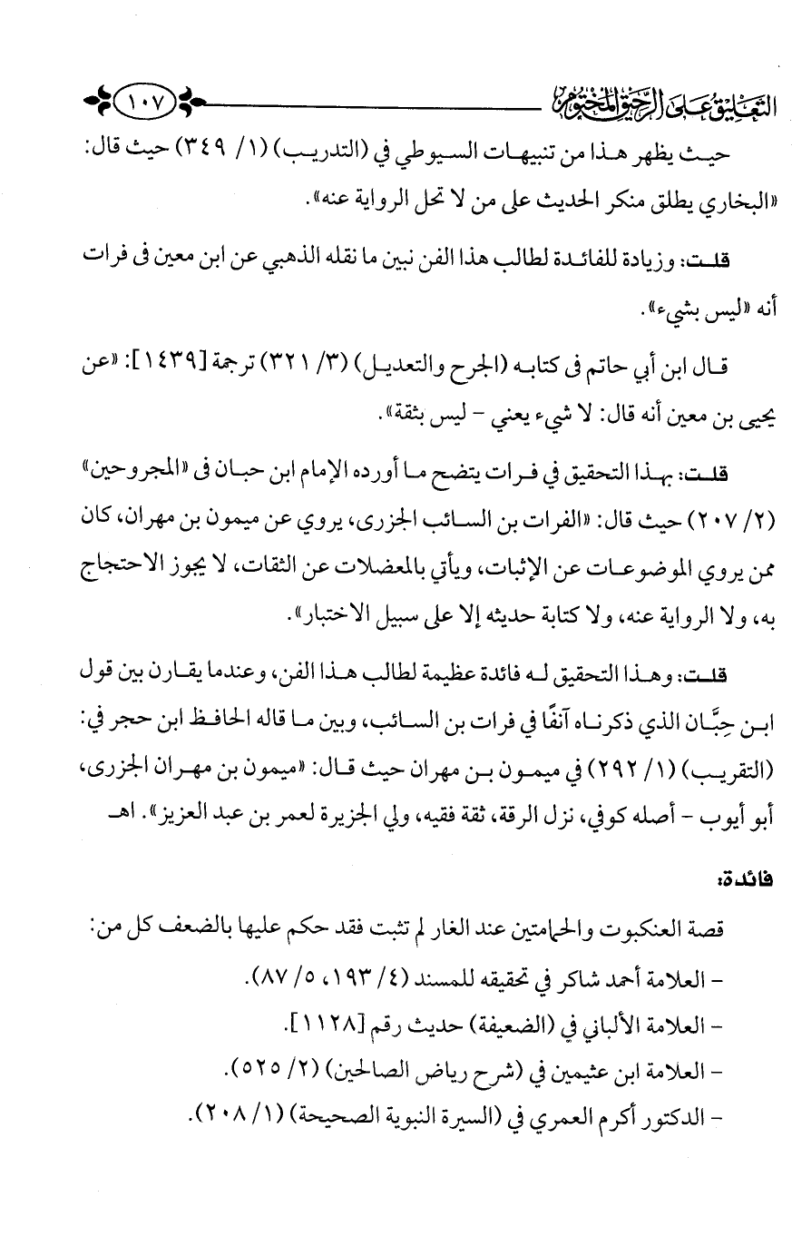 قلت: وهذا التحقيق له فائدة عظيمة لطالب هذا الفن، وعندما يقارن بين قول ابن حبان الذي ذكرناه آنفاً في فرات بن السائب، وبين ما قاله الحافظ ابن حجر في: " التقريب " (1/ 292) في ميمون بن مهران حيث قال: " ميمون بن مهران الجزرى، أبو أيوب - أصله كوفي، نزل الرقة، ثقة فقيه، ولي الجزيرة لعمر بن عبد العزيز ". ا. هـ