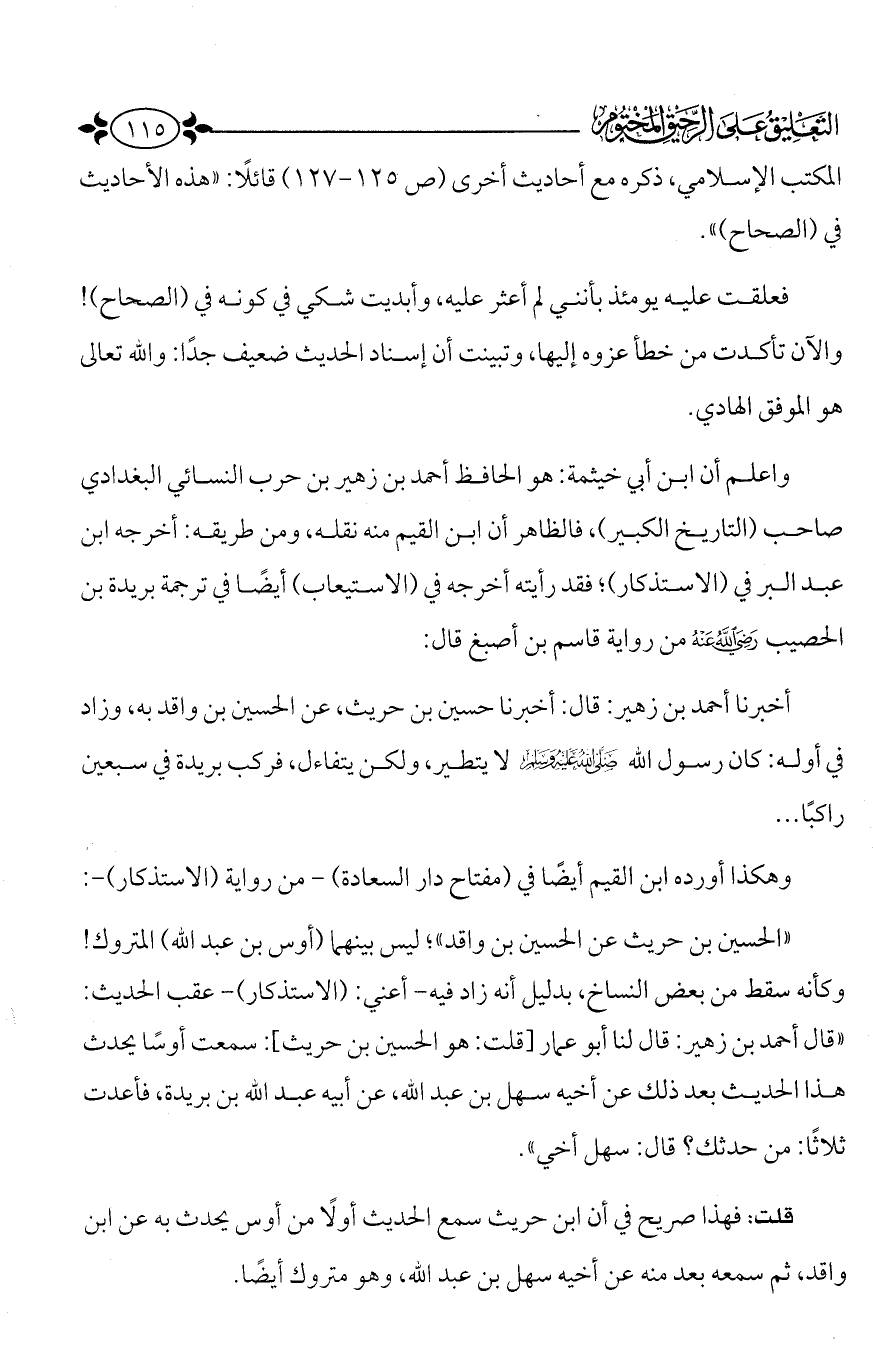 "الحسين بن حريث عن الحسين بن واقد"؛ ليس بينهما (أوس بن عبد الله) المتروك! وكأنه سقط من بعض النساخ، بدليل أنه زاد فيه - أعني: "الاستذكار" - عقب الحديث: "قال أحمد بن زهير: قال لنا أبو عمار [قلت: هو الحسين بن حريث]: سمعت أوساً يحدث هذا الحديث بعد ذلك عن أخيه سهل بن عبد الله، عن أبيه عبد الله بن بريدة، فأعدت ثلاثاً: من حدثك؟ قال: سهل أخي".