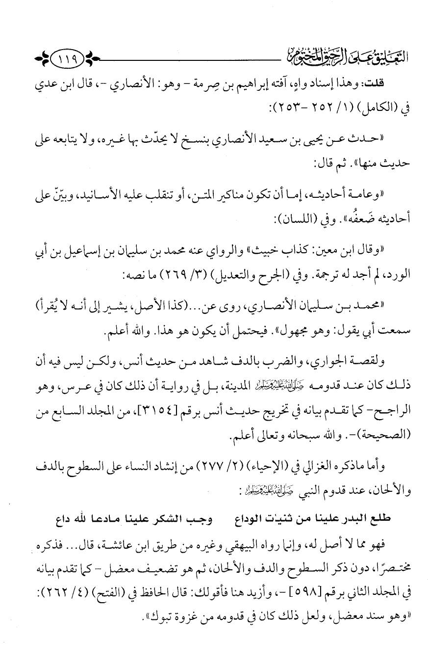 فهو مما لا أصل له، وإنما رواه البيهقي وغيره من طريق إبن عائشة، قال ... فذكره مختصراً، دون ذكر السطوح والدف والألحان، ثم هو تضعيف معضل - كما تقدم بيانه في المجلد الثاني برقم (598) -، وأزيد هنا فأقولك: قال الحافظ في "الفتح" (4/ 262): "وهو سند معضل، ولعل ذلك كان في قدومه من غزوة تبوك".