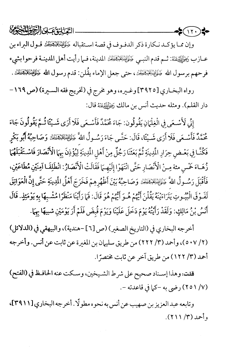 وإن مما يؤكد نكارة ذكر الدفوف في قصة استقباله - صَلَّى اللَّهُ عَلَيْهِ وَسَلَّمَ - قول البراء بن عازب - رضي الله عنه -: ثم قدم النبي - صَلَّى اللَّهُ عَلَيْهِ وَسَلَّمَ - المدينة، فما رأيت أهل المدينة فرحوا بشيء فرحهم برسول الله - صَلَّى اللَّهُ عَلَيْهِ وَسَلَّمَ -، حتى جعل الإماء يقُلن: قدم رسول الله - صَلَّى اللَّهُ عَلَيْهِ وَسَلَّمَ -.
