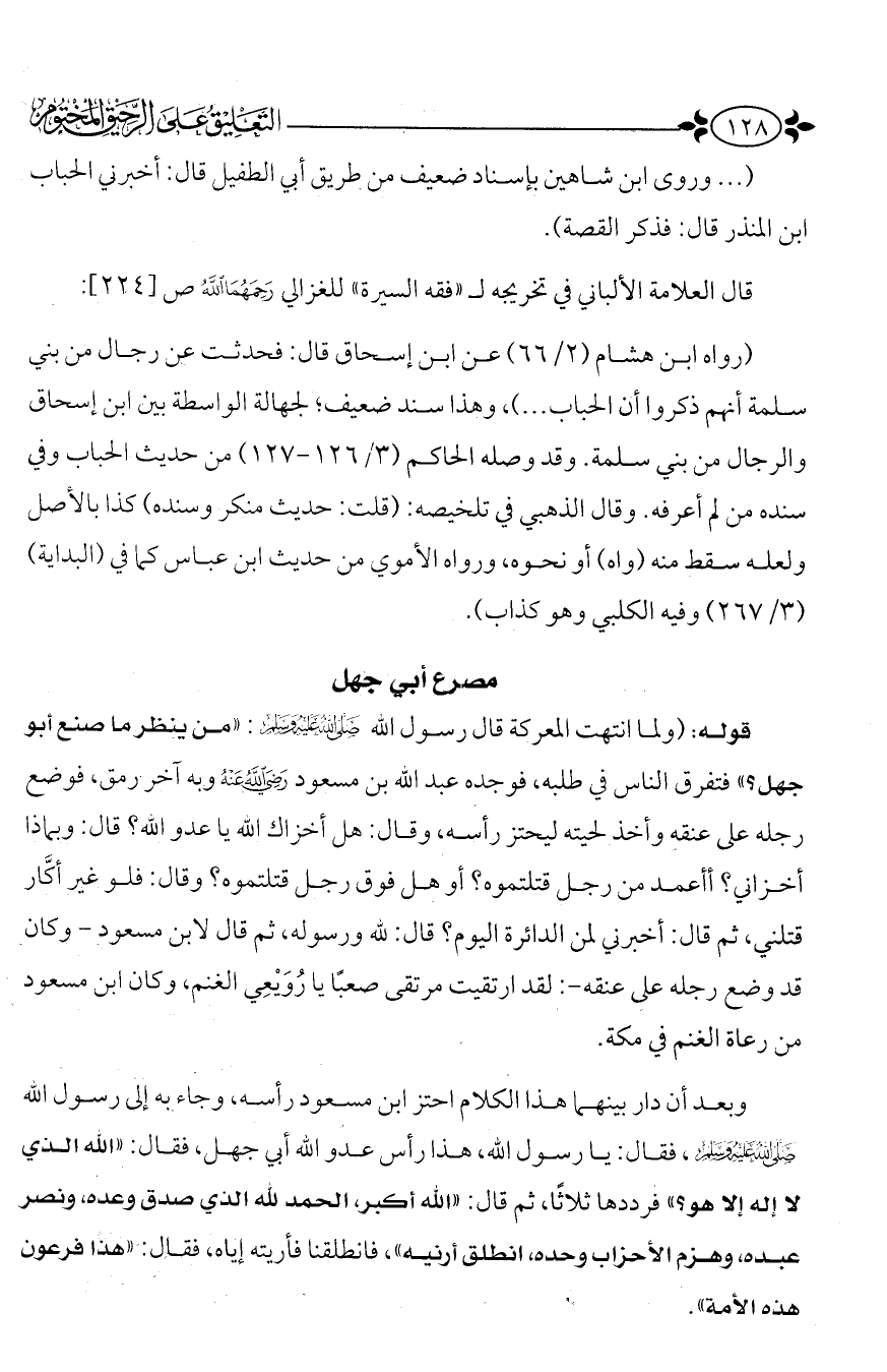 قوله: (ولما انتهت المعركة قال رسول الله - صَلَّى اللَّهُ عَلَيْهِ وَسَلَّمَ -: (من ينظر ما صنع أبو جهل؟) فتفرق الناس في طلبه، فوجده عبد الله بن مسعود رضي الله عنه وبه آخر رمق، فوضع رجله على عنقه وأخذ لحيته ليحتز رأسه، وقال: هل أخزاك الله يا عدو الله؟ قال: وبماذا أخزاني؟ أأعمد من رجل قتلتموه؟ أو هل فوق رجل قتلتموه؟ وقال: فلو غير أكَّار قتلني، ثم قال: أخبرني لمن الدائرة اليوم؟ قال: لله ورسوله، ثم قال لابن مسعود - وكان قد وضع رجله على عنقه -: لقد ارتقيت مرتقى صعبًا يا رُوَيْعِي الغنم، وكان ابن مسعود من رعاة الغنم في مكة.