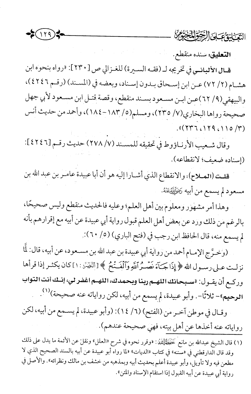 قلت (الملاح): والانقطاع الذي أشارا إليه هو أن أبا عبيدة عامر بن عبد الله بن مسعود لم يسمع من أبيه - رضي الله عنه -.