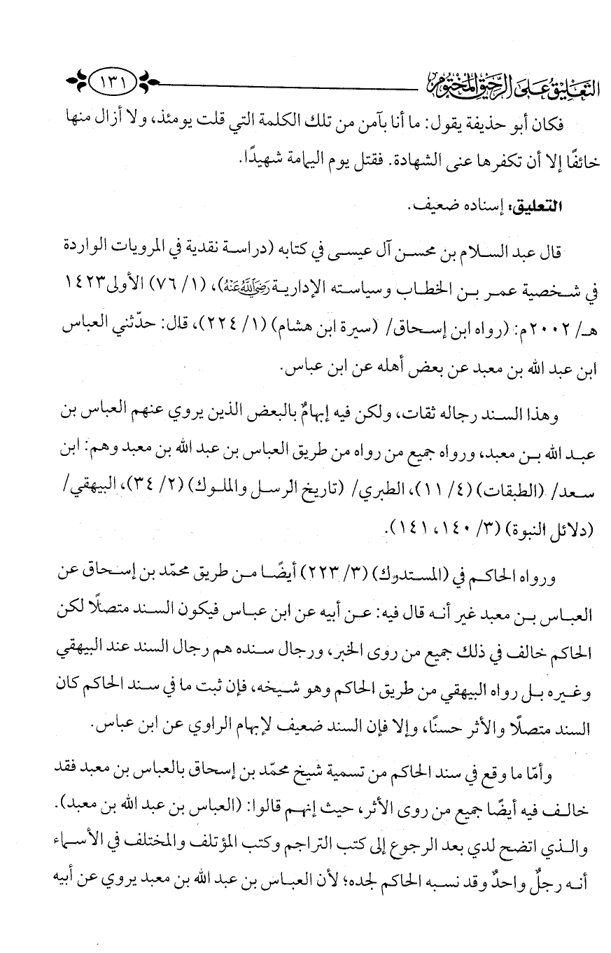 قال عبد السلام بن محسن آل عيسى في كتابه دراسة نقدية في المرويات الواردة في شخصية عمر بن الخطاب وسياسته الإدارية - رضي الله عنه -، (1/ 76) الأولى1423 هـ/2002م: