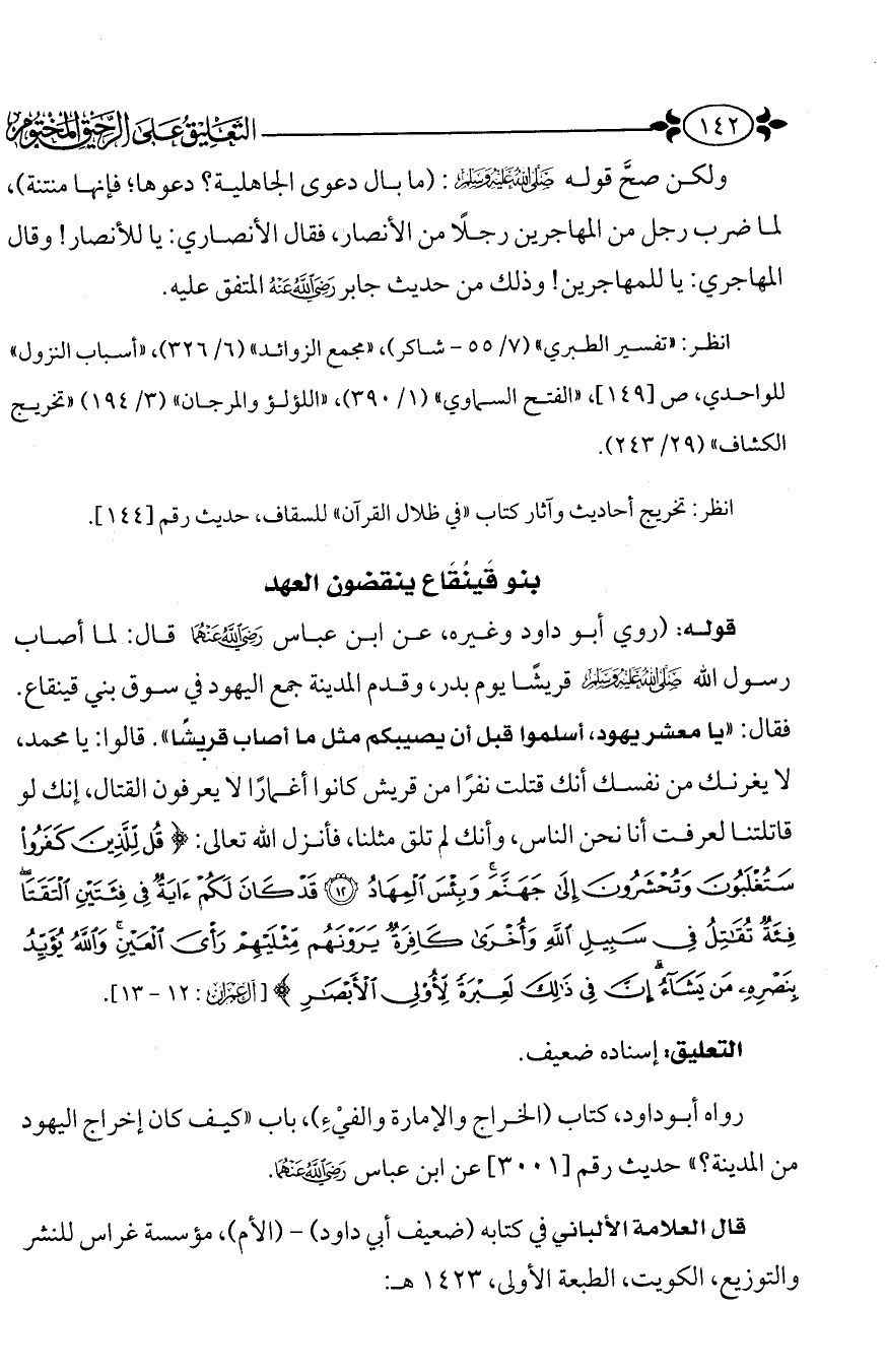 قوله: (روي أبو داود وغيره، عن ابن عباس - رضي الله عنهما - قال: لما أصاب رسول الله - صَلَّى اللَّهُ عَلَيْهِ وَسَلَّمَ - قريشاً يوم بدر، وقدم المدينة جمع اليهود في سوق بني قينقاع. فقال: (يا معشر يهود، أسلموا قبل أن يصيبكم مثل ما أصاب قريشاً). قالوا: يا محمد، لا يغرنك من نفسك أنك قتلت نفراً من قريش كانوا أغماراً لا يعرفون القتال، إنك لو قاتلتنا لعرفت أنا نحن الناس، وأنك لم تلق مثلنا، فأنزل الله تعالى: {قُل لِّلَّذِينَ كَفَرُوا سَتُغْلَبُونَ وَتُحْشَرُونَ إِلَى جَهَنَّمَ وَبِئْسَ الْمِهَادُ * قَدْ كَانَ لَكُمْ آيَةٌ فِي فِئَتَيْنِ الْتَقَتَا فِئَةٌ تُقَاتِلُ فِي سَبِيلِ اللهِ وَأُخْرَى كَافِرَةٌ يَرَوْنَهُم مِّثْلَيْهِمْ رَايَ الْعَيْنِ وَاللهُ يُؤَيِّدُ بِنَصْرِهِ مَن يَشَاء إِنَّ فِي ذَلِكَ لَعِبْرَةً لَّأُوْلِي الأَبْصَارِ} [آل عمران 12، 13].