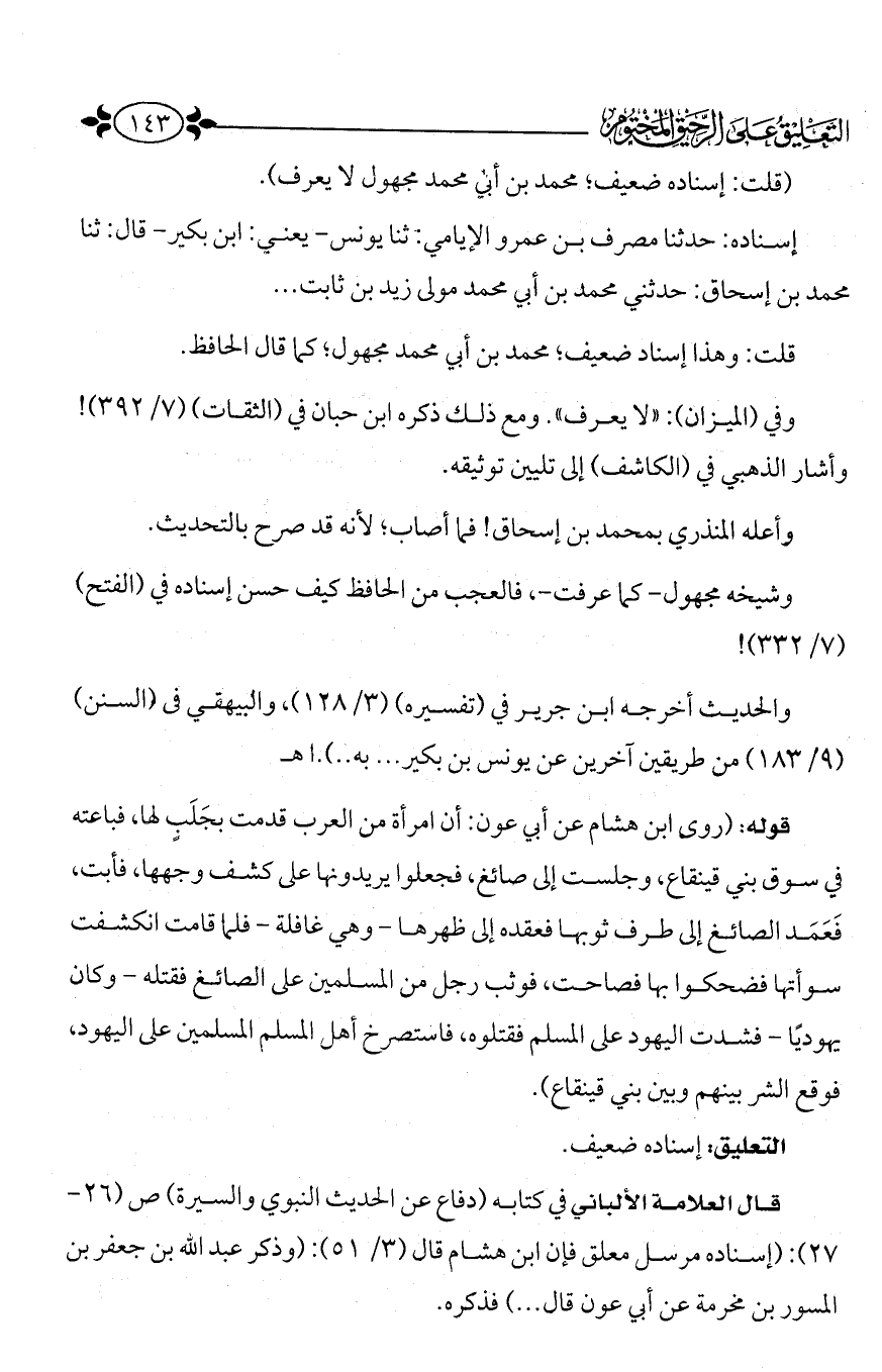 قوله: (روى ابن هشام عن أبي عون: أن امرأة من العرب قدمت بجَلَبٍ لها، فباعته في سوق بني قينقاع، وجلست إلى صائغ، فجعلوا يريدونها على كشف وجهها، فأبت، فَعَمَد الصائغ إلى طرف ثوبها فعقده إلى ظهرها - وهي غافلة - فلما قامت انكشفت سوأتها فضحكوا بها فصاحت، فوثب رجل من المسلمين على الصائغ فقتله - وكان يهودياً - فشدت اليهود على المسلم فقتلوه، فاستصرخ أهل المسلم المسلمين على اليهود، فوقع الشر بينهم وبين بني قينقاع).