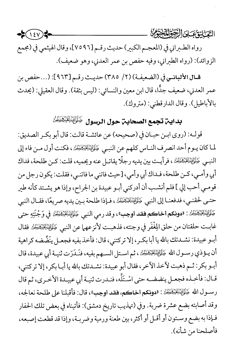 قوله: (روى ابن حبان في صحيحه عن عائشة قالت: قال أبو بكر الصديق: لما كان يوم أحد انصرف الناس كلهم عن النبي - صَلَّى اللَّهُ عَلَيْهِ وَسَلَّمَ -، فكنت أول من فاء إلى النبي - صَلَّى اللَّهُ عَلَيْهِ وَسَلَّمَ -، فرأيت بين يديه رجلاً يقاتل عنه ويحميه، قلت: كن طلحة، فداك أبي وأمي، كن طلحة، فداك أبي وأمي، [حيث فاتني ما فاتني، فقلت: يكون رجل من قومي أحب إلي] فلم أنشب أن أدركني أبو عبيدة بن الجراح، وإذا هو يشتد كأنه طير حتى لحقني، فدفعنا إلى النبي - صَلَّى اللَّهُ عَلَيْهِ وَسَلَّمَ -، فإذا طلحة بين يديه صريعاً، فقال النبي صَلَّى اللَّهُ عَلَيْهِ وَسَلَّمَ: (دونكم أخاكم فقد أوجب)، وقد رمي النبي - صَلَّى اللَّهُ عَلَيْهِ وَسَلَّمَ - في وَجْنَتِهِ حتى غابت حلقتان من حلق المِغْفَر في وجنته، فذهبت لأنزعهما عن النبي - صَلَّى اللَّهُ عَلَيْهِ وَسَلَّمَ - فقال أبو عبيدة: نشدتك بالله يا أبا بكر، إلا تركتني، قال: فأخذ بفيه فجعل ينَضِّضه كراهية أن يؤذي رسول الله - صَلَّى اللَّهُ عَلَيْهِ وَسَلَّمَ -، ثم استل السهم بفيه، فنَدَرَت ثنية أبي عبيدة، قال أبو بكر: ثم ذهبت لآخذ الآخر، فقال أبو عبيدة: نشدتك بالله يا أبا بكر، إلا تركتني، قال: فأخذه فجعل ينضضه حتى اسْتَلَّه، فندرت ثنية أبي عبيدة الأخرى، ثم قال رسول الله - صَلَّى اللَّهُ عَلَيْهِ وَسَلَّمَ -: (دونكم أخاكم، فقد أوجب)، قال: فأقبلنا على طلحة نعالجه، وقد أصابته بضع عشرة ضربة. وفي تهذيب تاريخ دمشق: فأتيناه في بعض تلك الحفار فإذا به بضع وستون أو أقل أو أكثر، بين طعنة ورمية وضربة، وإذا قد قطعت إصبعه، فأصلحنا من شأنه).