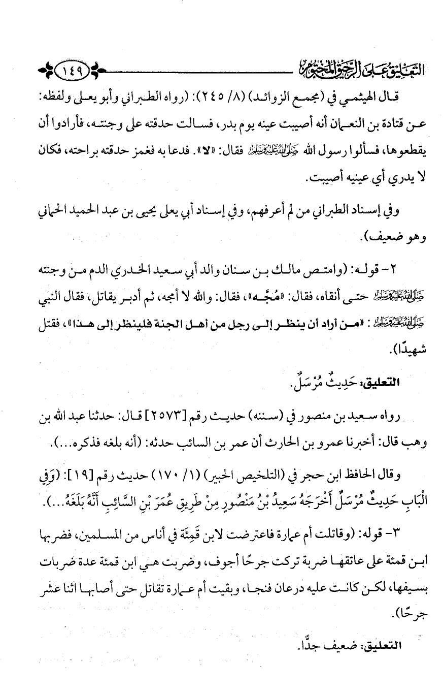 قال الهيثمي في مجمع الزوائد (8/ 245): (رواه الطبراني وأبو يعلى ولفظه: عن قتادة بن النعمان أنه أصيبت عينه يوم بدر، فسالت حدقته على وجنته، فأرادوا أن يقطعوها، فسألوا رسول الله - صَلَّى اللَّهُ عَلَيْهِ وَسَلَّمَ - فقال: "لا". فدعا به فغمز حدقته براحته، فكان لا يدري أي عينيه أصيبت.