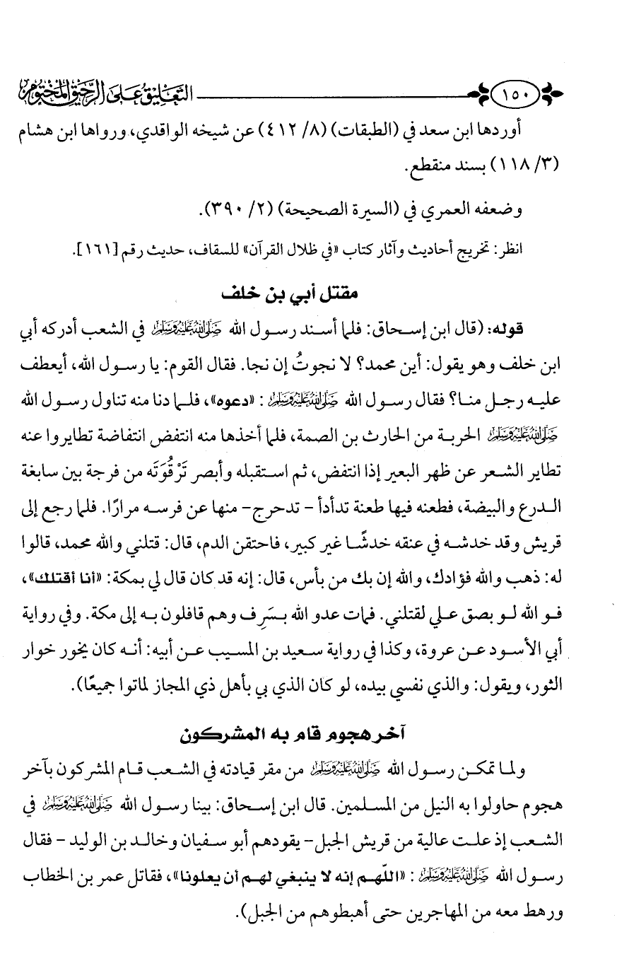 يا رسول الله، أيعطف عليه رجل منا؟ فقال رسول الله صَلَّى اللَّهُ عَلَيْهِ وَسَلَّمَ: (دعوه)، فلما دنا منه تناول رسول الله - صَلَّى اللَّهُ عَلَيْهِ وَسَلَّمَ - الحربة من الحارث بن الصمة، فلما أخذها منه انتفض انتفاضة تطايروا عنه تطاير الشعر عن ظهر البعير إذا انتفض، ثم استقبله وأبصر تَرْقُوَتَه من فرجة بين سابغة الدرع والبيضة، فطعنه فيها طعنة تدأدأ - تدحرج - منها عن فرسه مراراً. فلما رجع إلى قريش وقد خدشه في عنقه خدشاً غير كبير، فاحتقن الدم، قال: قتلني والله محمد، قالوا له: ذهب والله فؤادك، والله إن بك من بأس، قال: إنه قد كان قال لي بمكة: (أنا أقتلك)، فو الله لو بصق علي لقتلني. فمات عدو الله بسَرِف وهم قافلون به إلى مكة. وفي رواية أبي الأسود عن عروة، وكذا في رواية سعيد بن المسيب عن أبيه: أنه كان يخور خوار الثور، ويقول: والذي نفسي بيده، لو كان الذي بي بأهل ذي المجاز لماتوا جميعاً).
