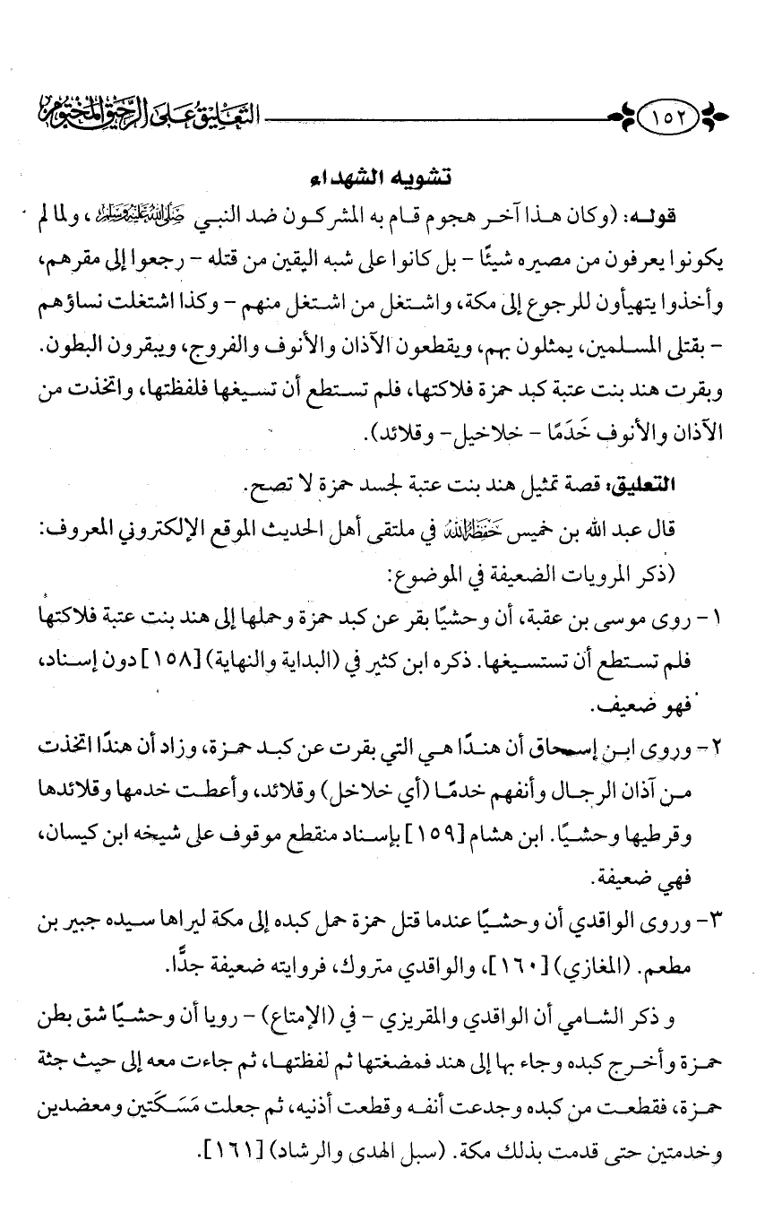 2 - وروى ابن إسحاق أن هنداً هي التي بقرت عن كبد حمزة، وزاد أن هنداً اتخذت من آذان الرجال وأنفهم خدماً (أي خلاخل) وقلائد، وأعطت خدمها وقلائدها وقرطيها وحشياً. ابن هشام (159) بإسناد منقطع موقوف على شيخه ابن كيسان، فهي ضعيفة.