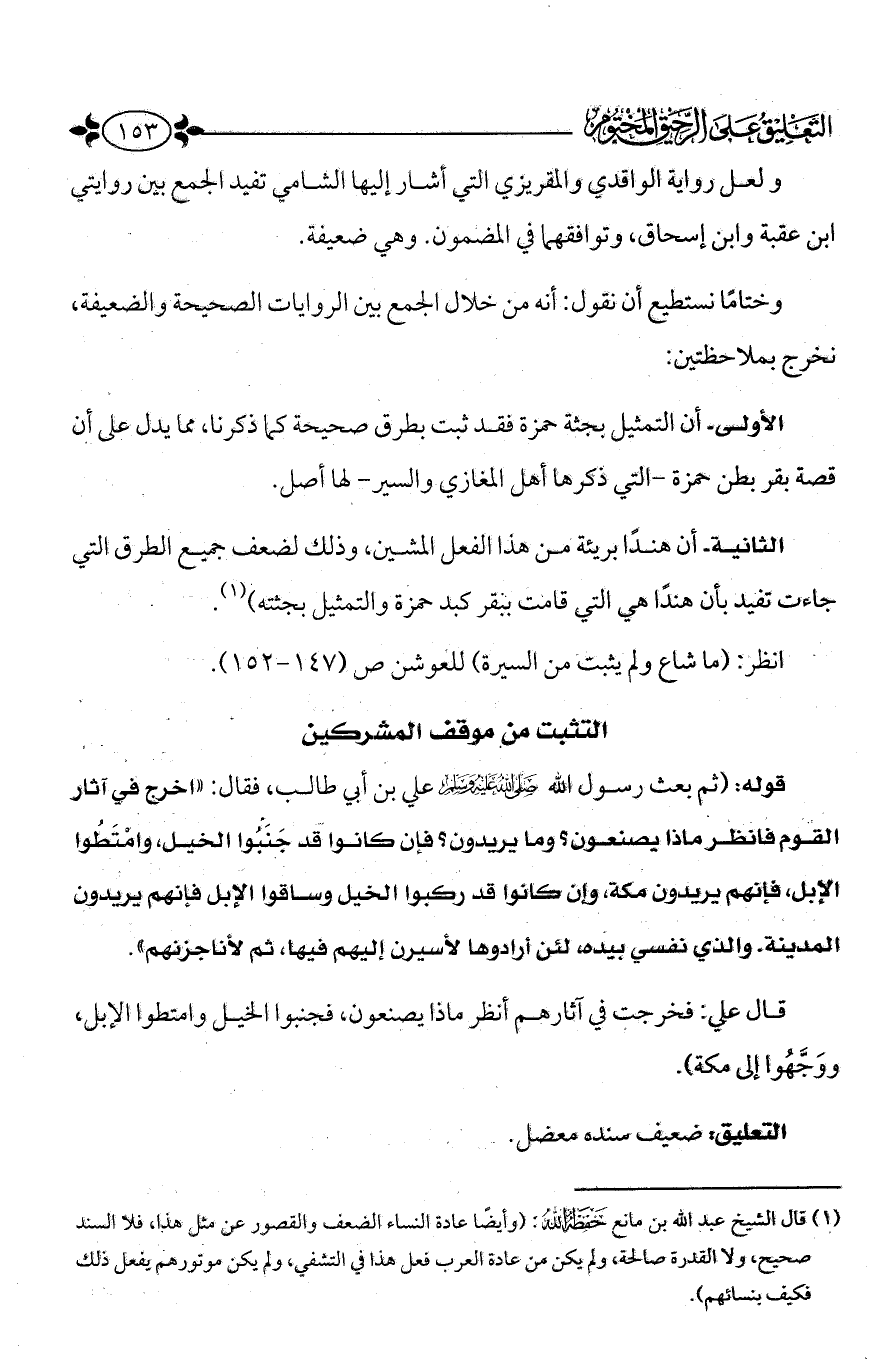 (¬1) قال الشيخ عبد الله بن مانع - حفظه الله -: (وأيضا عادة النساء الضعف والقصور عن مثل هذا، فلا السند صحيح، ولا القدرة صالحة، ولم يكن من عادة العرب فعل هذا في التشفي، ولم يكن موتورهم يفعل ذلك فكيف بنسائهم).