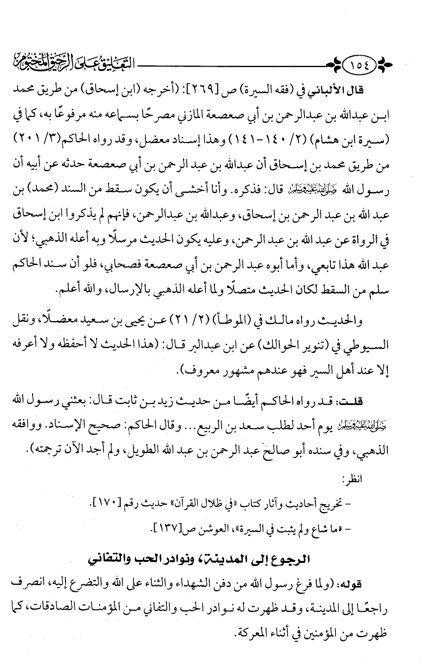 قال الألباني في فقه السيرة ص (269): (أخرجه (ابن إسحاق) من طريق محمد بن عبد الله بن عبدالرحمن بن أبي صعصعة المازني مصرحاً بسماعه منه مرفوعاً به، كما في سيرة ابن هشام (2/ 140 - 141) وهذا إسناد معضل، وقد رواه الحاكم (3/ 201) من طريق محمد بن إسحاق أن عبد الله بن عبد الرحمن بن أبي صعصعة حدثه عن أبيه أن رسول الله - صَلَّى اللَّهُ عَلَيْهِ وَسَلَّمَ - قال: فذكره. وأنا أخشى أن يكون سقط من السند (محمد) بن عبد الله بن عبدالرحمن بن إسحاق، وعبد الله بن عبدالرحمن، فإنهم لم يذكروا ابن إسحاق في الرواة عن عبد الله بن عبدالرحمن، وعليه يكون الحديث مرسلاً وبه أعله الذهبي؛ لأن عبد الله هذا تابعي، وأما أبوه عبدالرحمن بن أبي صعصعة فصحابي، فلو أن سند الحاكم سلم من السقط لكان الحديث متصلاً ولما أعله الذهبي بالإرسال، والله أعلم.