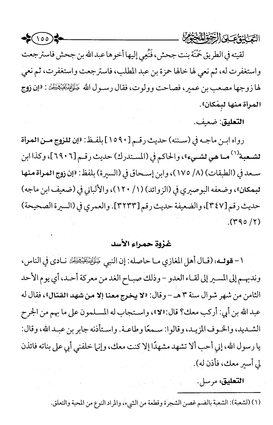 1 - قوله: (قال أهل المغازي ما حاصله: إن النبي - صَلَّى اللَّهُ عَلَيْهِ وَسَلَّمَ - نادي في الناس، وندبهم إلى المسير إلى لقاء العدو - وذلك صباح الغد من معركة أحد، أي يوم الأحد الثامن من شهر شوال سنة 3 هـ - وقال: (لا يخرج معنا إلا من شهد القتال)، فقال له عبد الله بن أبي: أركب معك؟ قال: (لا)، واستجاب له المسلمون على ما بهم من الجرح الشديد، والخوف المزيد، وقالوا: سمعاً وطاعة. واستأذنه جابر بن عبد الله، وقال: يا رسول الله، إني أحب ألا تشهد مشهداً إلا كنت معك، وإنما خلفني أبي على بناته فائذن لي أسير معك، فأذن له).