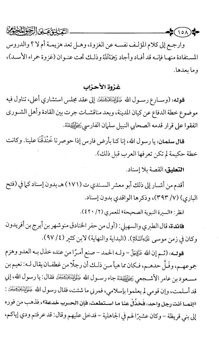 قوله: (وسارع رسول الله - صَلَّى اللَّهُ عَلَيْهِ وَسَلَّمَ - إلى عقد مجلس استشاري أعلى، تناول فيه موضوع خطة الدفاع عن كيان المدينة، وبعد مناقشات جرت بين القادة وأهل الشورى اتفقوا على قرار قدمه الصحابي النبيل سلمان الفارسي - رضي الله عنه -.