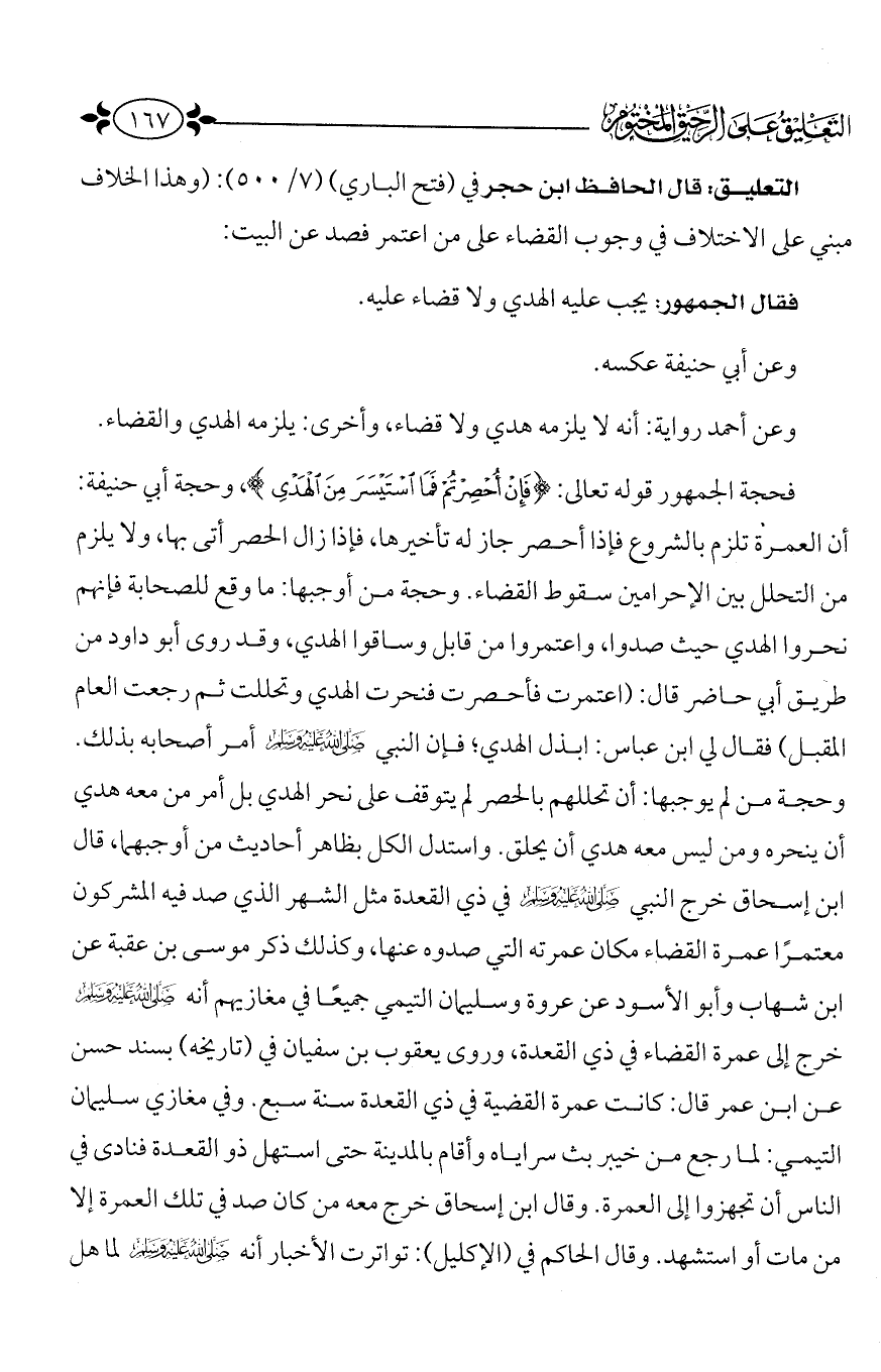 فحجة الجمهور قوله تعالى: (فإن أحصرتم فما استيسر من الهدي)، وحجة أبي حنيفة: أن العمرة تلزم بالشروع فإذا أحصر جاز له تأخيرها، فإذا زال الحصر أتى بها، ولا يلزم من التحلل بين الإحرامين سقوط القضاء. وحجة من أوجبها: ما وقع للصحابة فإنهم نحروا الهدي حيث صدوا، واعتمروا من قابل وساقوا الهدي، وقد روى أبو داود من طريق أبي حاضر قال: (اعتمرت فأحصرت فنحرت الهدي وتحللت ثم رجعت العام المقبل) فقال لي ابن عباس: ابذل الهدي؛ فإن النبي - صَلَّى اللَّهُ عَلَيْهِ وَسَلَّمَ - أمر أصحابه بذلك. وحجة من لم يوجبها: أن تحللهم بالحصر لم يتوقف على نحر الهدي بل أمر من معه هدي أن ينحره ومن ليس معه هدي أن يحلق. واستدل الكل بظاهر أحاديث من أوجبهما، قال ابن إسحاق خرج النبي - صَلَّى اللَّهُ عَلَيْهِ وَسَلَّمَ - في ذي القعدة مثل الشهر الذي صد فيه المشركون معتمراً عمرة القضاء مكان عمرته التي صدوه عنها، وكذلك ذكر موسى بن عقبة عن ابن شهاب وأبو الأسود عن عروة وسليمان التيمي جميعا في مغازيهم أنه - صَلَّى اللَّهُ عَلَيْهِ وَسَلَّمَ - خرج إلى عمرة القضاء في ذي القعدة، وروى يعقوب بن سفيان في تاريخه بسند حسن عن ابن عمر قال: كانت عمرة القضية في ذي القعدة سنة سبع. وفي مغازي سليمان التيمي: لما رجع من خيبر بث سراياه وأقام بالمدينة حتى استهل ذو القعدة فنادى في الناس أن تجهزوا إلى العمرة. وقال ابن إسحاق خرج معه من كان صد في تلك العمرة إلا من مات أو استشهد. وقال الحاكم في الإكليل: تواترت الأخبار أنه - صَلَّى اللَّهُ عَلَيْهِ وَسَلَّمَ - لما هل
