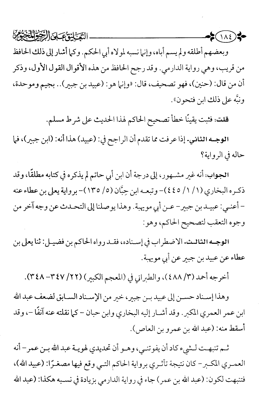 الجواب: أنه غير مشهور، إلى درجة أن ابن أبي حاتم لم يذكره في كتابه مطلقاً، وقد ذكره البخاري (1/ 1/445) - وتبعه ابن حبان (5/ 135) - برواية يعلى بن عطاء عنه - أعني: عبيد بن جبير - عن أبي مويهبة. وهذا يوصلنا إلى التحدث عن وجه آخر من وجوه التعقب لتصحيح الحاكم، وهو: