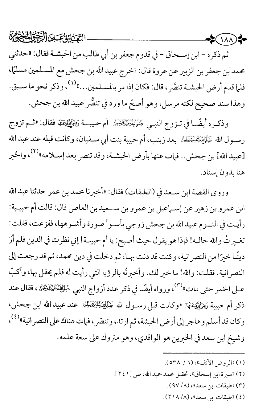 وروى القصة ابن سعد في (الطبقات) فقال: «أخبرنا محمد ابن عمر حدثنا عبد الله بن عمرو بن زهير عن إسماعيل بن عمرو بن سعيد بن العاص قال: قالت أم حبيبة: رأيت في النوم عبيد الله بن جحش زوجي بأسوأ صورة وأشوهها، ففزعت، فقلت: تغيرتْ والله حاله! فإذا هو يقول حيث أصبح: يا أم حبيبة! إني نظرت في الدين فلم أرَ ديناً خيراً من النصرانية، وكنت قد دنت بها، ثم دخلت في دين محمد، ثم قد رجعت إلى النصرانية. فقلت: والله! ما خير لك. وأخبرتُه بالرؤيا التي رأيت له فلم يحفل بها، وأكبّ على الخمر حتى مات» (¬3)، ورواه أيضاً في ذكر عدد أزواج النبي صَلَّى اللَّهُ عَلَيْهِ وَسَلَّمَ، فقال عند ذكر أم حبيبة - رضي الله عنها -: «وكانت قبل رسول الله صَلَّى اللَّهُ عَلَيْهِ وَسَلَّمَ عند عبيد الله بن جحش، وكان قد أسلم وهاجر إلى أرض الحبشة، ثم ارتد، وتنصّر، فمات هناك على النصرانية» (¬4)، وشيخ ابن سعد في الخبرين هو الواقدي، وهو متروك على سعة علمه.
