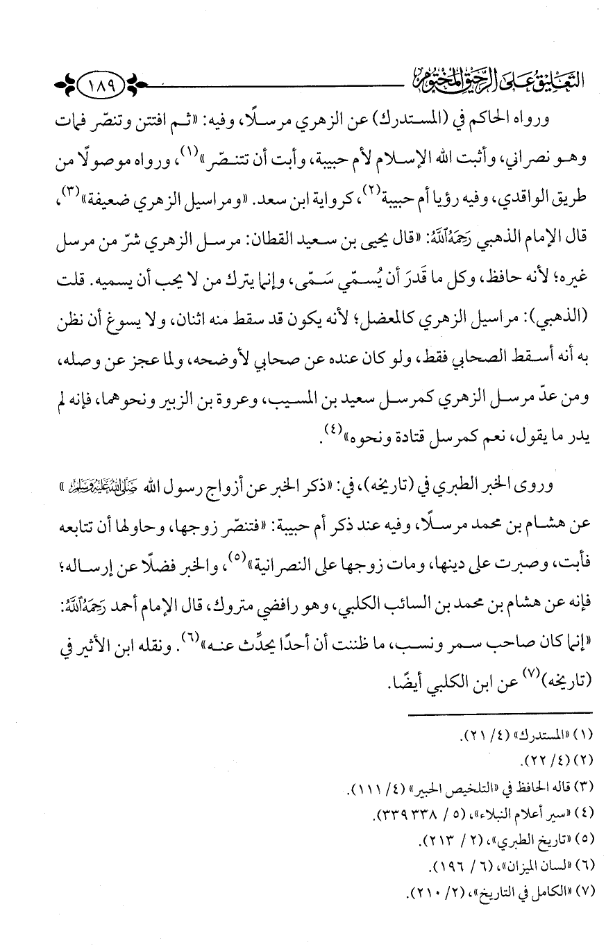 ورواه الحاكم في «المستدرك» عن الزهري مرسلاً، وفيه: «ثم افتتن وتنصّر فمات وهو نصراني، وأثبت الله الإسلام لأم حبيبة، وأبت أن تتنصّر» (¬1)، ورواه موصولاً من طريق الواقدي، وفيه رؤيا أم حبيبة (¬2)، كرواية ابن سعد. «ومراسيل الزهري ضعيفة» (¬3)، قال الإمام الذهبي - رحمه الله -: «قال يحيى بن سعيد القطان: مرسل الزهري شرّ من مرسل غيره؛ لأنه حافظ، وكل ما قَدرَ أن يُسمّي سَمّى، وإنما يترك من لا يحب أن يسميه. قلت (الذهبي): مراسيل الزهري كالمعضل؛ لأنه يكون قد سقط منه اثنان، ولا يسوغ أن نظن به أنه أسقط الصحابي فقط، ولو كان عنده عن صحابي لأوضحه، ولما عجز عن وصله، ومن عدّ مرسل الزهري كمرسل سعيد بن المسيب، وعروة بن الزبير ونحوهما، فإنه لم يدر ما يقول، نعم كمرسل قتادة ونحوه» (¬4).