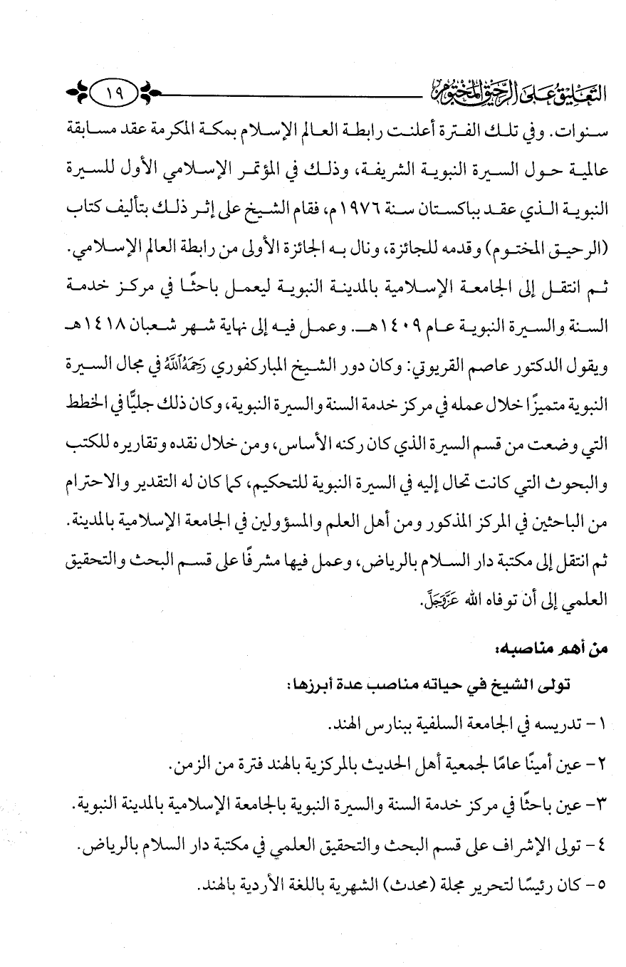 وفي تلك الفترة أعلنت رابطة العالم الإسلام بمكة المكرمة عقد مسابقة عالمية حول السيرة النبوية الشريفة، وذلك في المؤتمر الإسلامي الأول للسيرة النبوية الذي عقد بباكستان سنة 1976م, فقام الشيخ على إثر ذلك بتأليف كتاب (الرحيق المختوم) وقدمه للجائزة، ونال به الجائزة الأولى من رابطة العالم الإسلامي.
