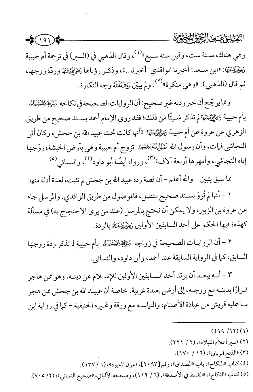 ومما يرجّح أن خبر ردته غير صحيح: أن الروايات الصحيحة في نكاحه - صَلَّى اللَّهُ عَلَيْهِ وَسَلَّمَ - بأم حبيبة - رضي الله عنها - لم تذكر شيئاً من ذلك؛ فقد روى الإمام أحمد بسند صحيح من طريق الزهري عن عروة عن أم حبيبة - رضي الله عنها -: «أنها كانت تحت عبيد الله بن جحش، وكان أتى النجاشي فمات، وأن رسول الله - صَلَّى اللَّهُ عَلَيْهِ وَسَلَّمَ - تزوج أم حبيبة وهي بأرض الحبشة، زوّجها إياه النجاشي، وأمهرها أربعة آلاف» (¬3)، ورواه أيضاً أبو داود (¬4)، والنسائي (¬5).