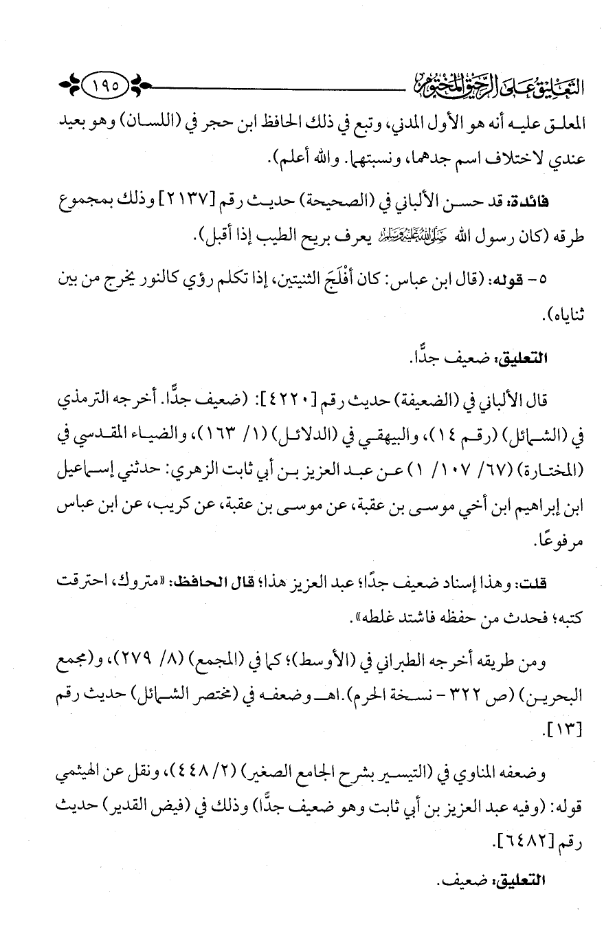 فائدة: قد حسن الألباني في الصحيحة حديث رقم (2137) وذلك بمجموع طرقه (كان رسول الله - صَلَّى اللَّهُ عَلَيْهِ وَسَلَّمَ - يعرف بريح الطيب إذا أقبل).