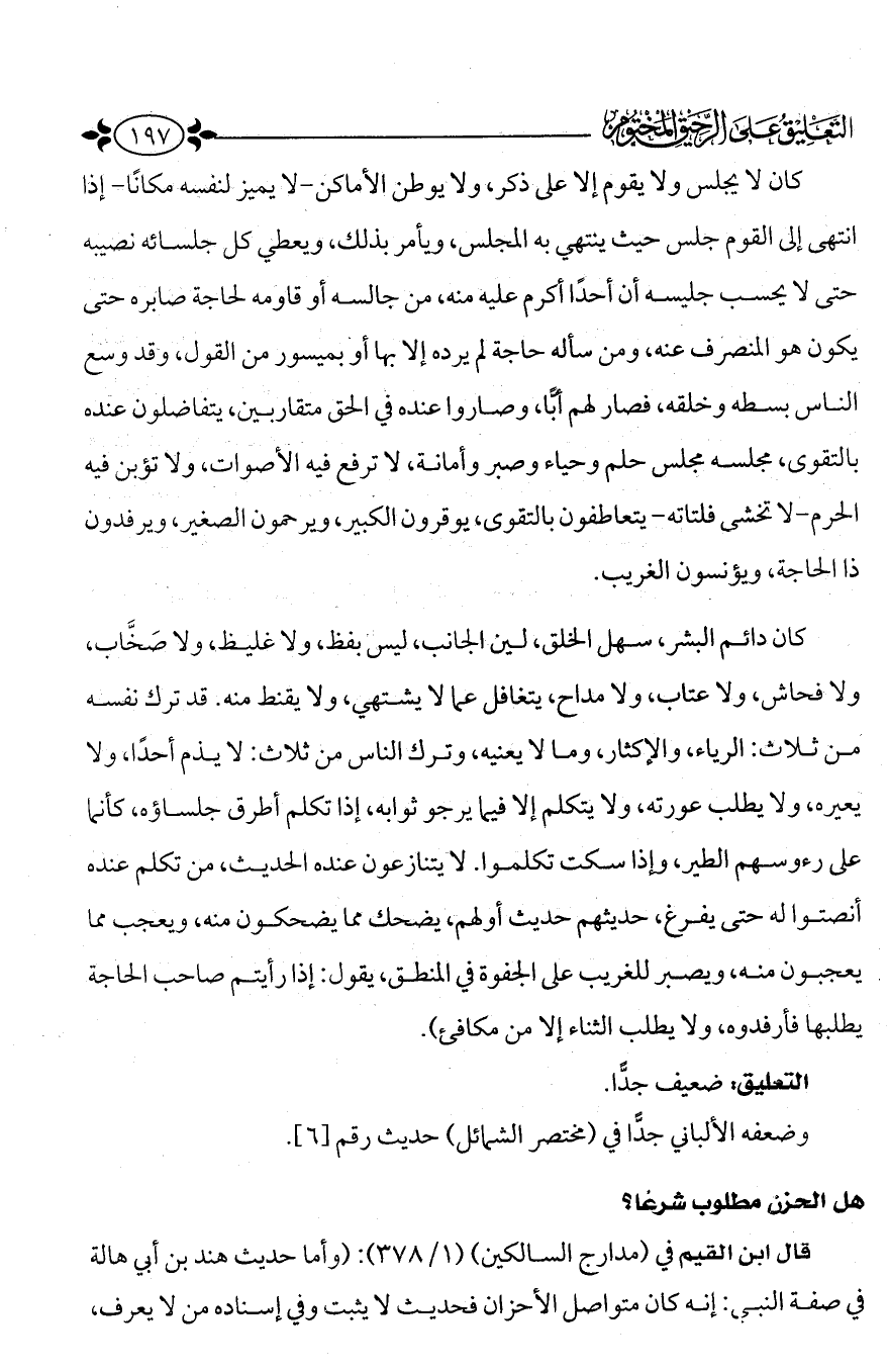 قال ابن القيم في مدارج السالكين (1/ 378): (وأما حديث هند بن أبي هالة في صفة النبي: إنه كان متواصل الأحزان فحديث لا يثبت وفي إسناده من لا يعرف،