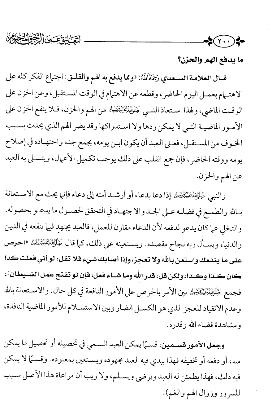 وجعل الأمور قسمين: قسماً يمكن العبد السعي في تحصيله أو تحصيل ما يمكن منه، أو دفعه أو تخفيفه فهذا يبدي فيه العبد مجهوده ويستعين بمعبوده. وقسماً لا يمكن فيه ذلك، فهذا يطمئن له العبد ويرضى ويسلم، ولا ريب أن مراعاة هذا الأصل سبب للسرور وزوال الهم والغم).