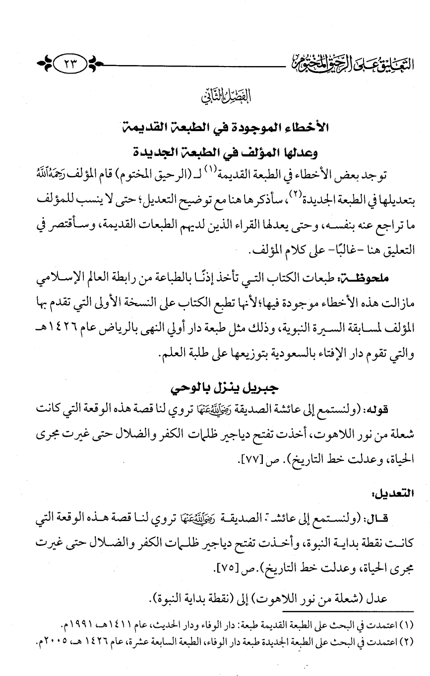 توجد بعض الأخطاء في الطبعة القديمة (¬1) للرحيق المختوم قام المؤلف - رحمه الله - بتعديلها في الطبعة الجديدة (¬2)، سأذكرها هنا مع توضيح التعديل؛ حتى لا ينسب للمؤلف ما تراجع عنه بنفسه، وحتى يعدلها القراء الذين لديهم الطبعات القديمة، وسأقتصر في التعليق هنا - غالباً - على كلام المؤلف.