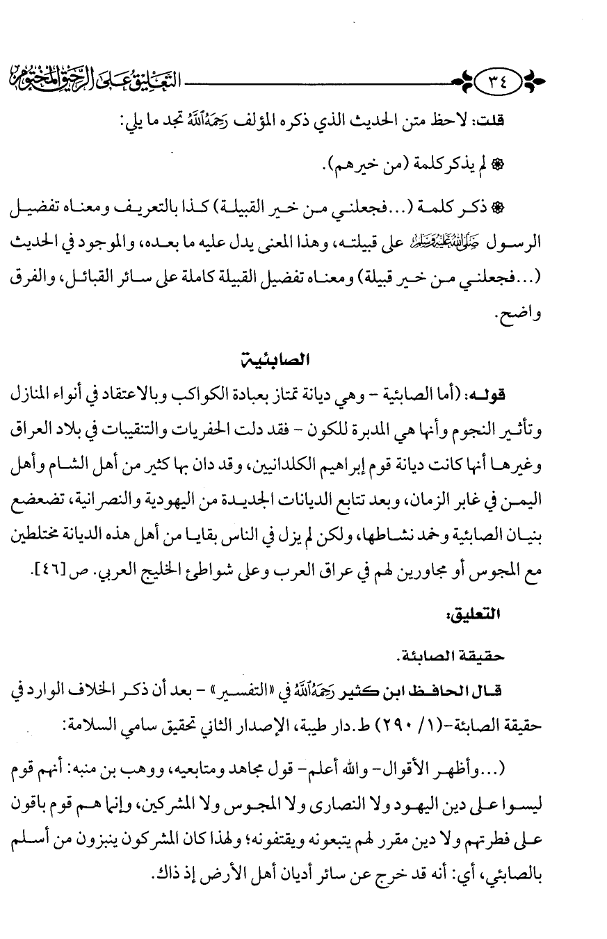 (... وأظهر الأقوال - والله أعلم - قول مجاهد ومتابعيه، ووهب بن منبه: أنهم قوم ليسوا على دين اليهود ولا النصارى ولا المجوس ولا المشركين، وإنما هم قوم باقون على فطرتهم ولا دين مقرر لهم يتبعونه ويقتفونه؛ ولهذا كان المشركون ينبزون من أسلم بالصابئي، أي: أنه قد خرج عن سائر أديان أهل الأرض إذ ذاك.