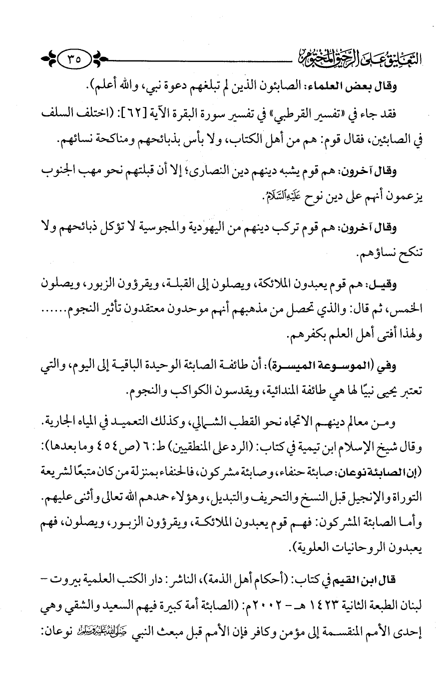 وقال شيخ الإسلام ابن تيمية في كتاب الرد على المنطقيين ط6 (ص454 وما بعدها): (إن الصابئة نوعان: صابئة حنفاء، وصابئة مشركون، فالحنفاء بمنزلة من كان متبعاً لشريعة التوراة والانجيل قبل النسخ والتحريف والتبديل، وهؤلاء حمدهم الله تعالى وأثنى عليهم.