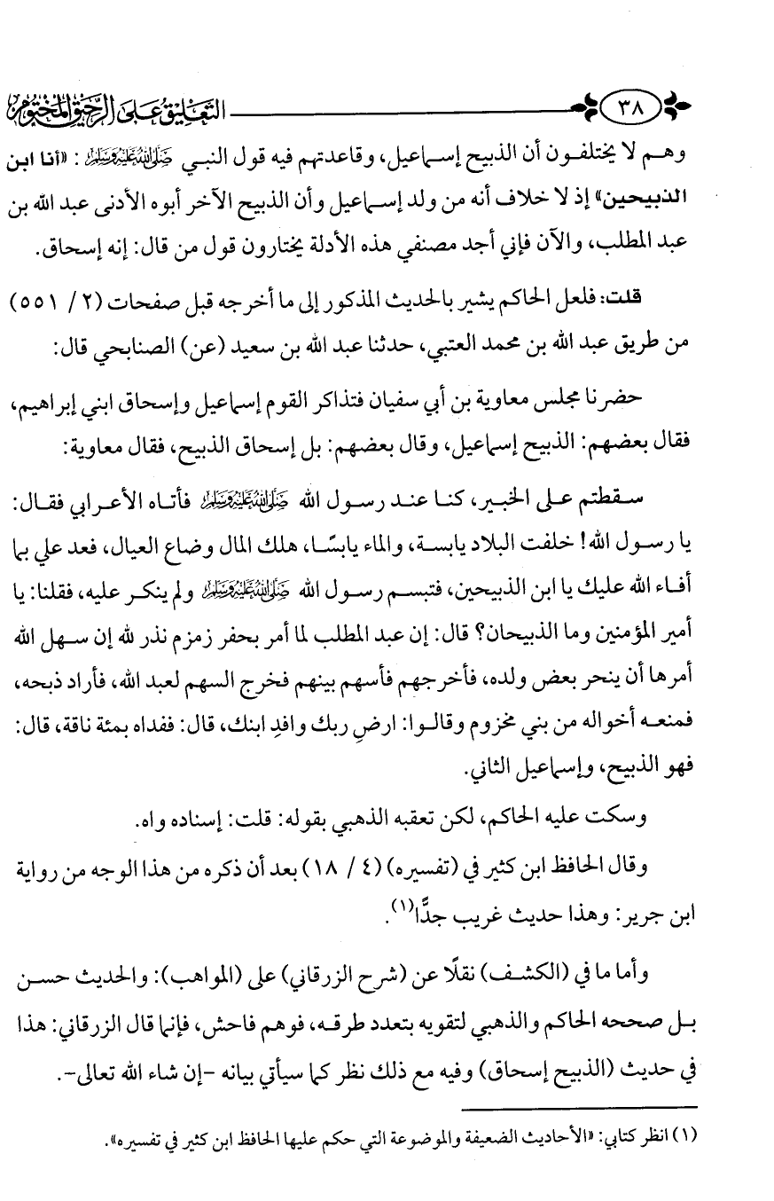 وهم لا يختلفون أن الذبيح إسماعيل، وقاعدتهم فيه قول النبي - صَلَّى اللَّهُ عَلَيْهِ وَسَلَّمَ -: (أنا ابن الذبيحين) إذ لا خلاف أنه من ولد إسماعيل وأن الذبيح الآخر أبوه الأدنى عبد الله بن عبد المطلب، والآن فإني أجد مصنفي هذه الأدلة يختارون قول من قال: إنه إسحاق.