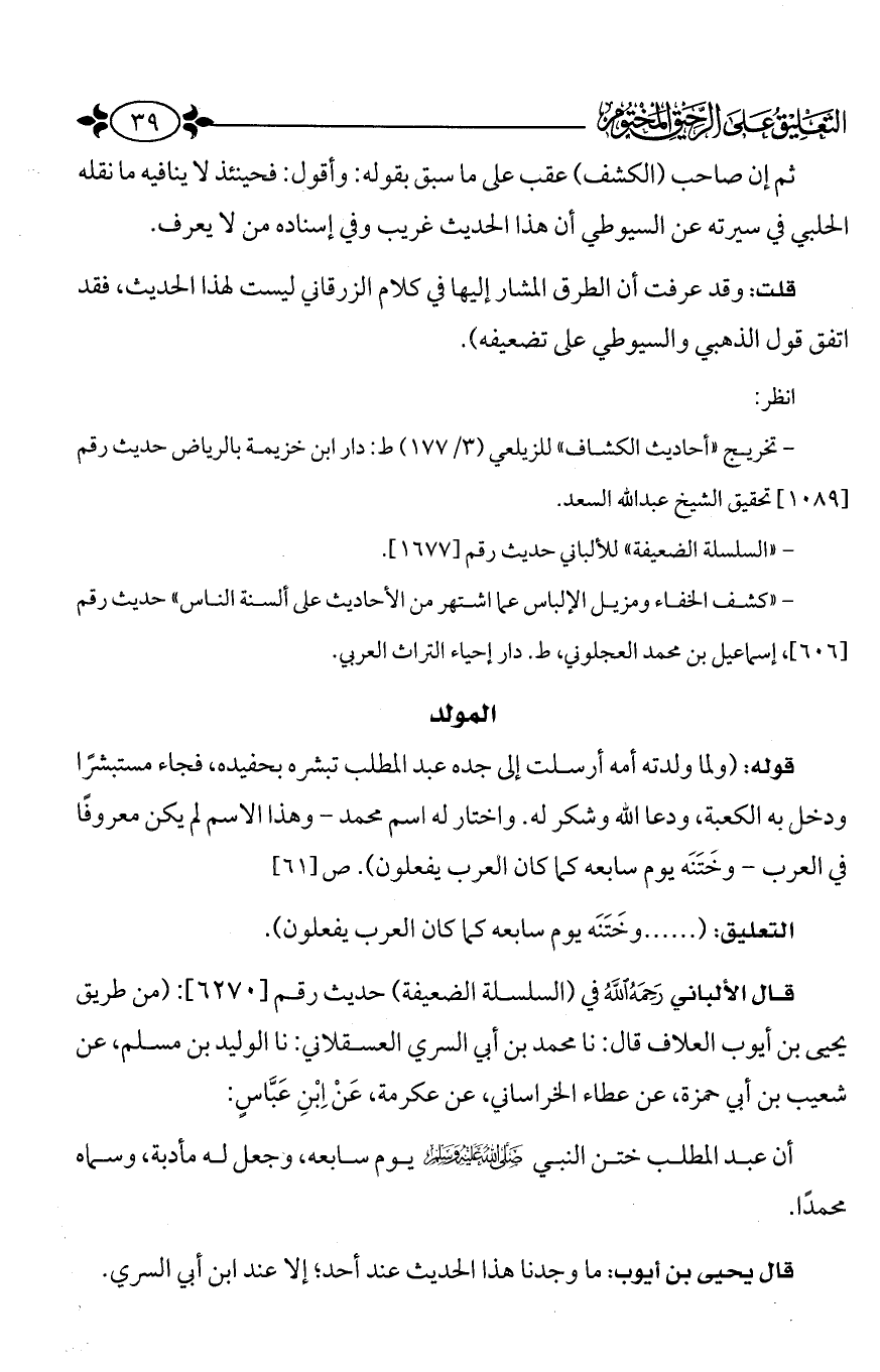 أن عبدالمطلب ختن النبي - صَلَّى اللَّهُ عَلَيْهِ وَسَلَّمَ - يوم سابعه، وجعل له مأدبة، وسماه محمداً.