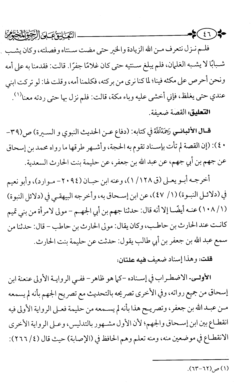 الأولى: الاضطراب في إسناده - كما هو ظاهر - ففي الرواية الأولى عنعنة ابن إسحاق من جميع رواته، وفي الأخرى تصريحه بالتحديث مع تصريح الجهم بأنه لم يسمعه من عبد الله بن جعفر، وتصريح هذا بأنه لم يسمعه من حليمة فعلى الرواية الأولى فيه انقطاع بين ابن إسحاق والجهم؛ لأن الأول مشهور بالتدليس، وعلى الرواية الأخرى الانقطاع في موضعين منه، ومنه تعلم وهم الحافظ في (الإصابة) حيث قال (4/ 266):