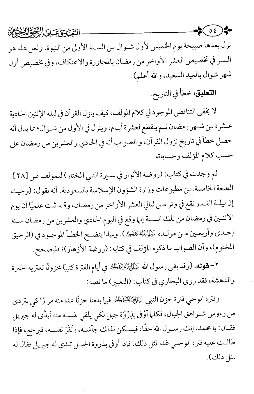 ثم وجدت في كتاب روضة الأنوار في سيرة النبي المختار للمؤلف ص (28).الطبعة الخامسة. من مطبوعات وزارة الشؤون الإسلامية بالسعودية. أنه يقول: (وحيث إن ليلة القدر تقع في وتر من ليالي العشر الأواخر من رمضان، وقد ثبت علمياً أن يوم الاثنين في رمضان من تلك السنة إنما وقع في اليوم الحادي والعشرين من رمضان سنة إحدى وأربعين من مولده - صَلَّى اللَّهُ عَلَيْهِ وَسَلَّمَ -). وبهذا يتضح الخطأ الموجود في الرحيق المختوم، وأن الصواب ما ذكره المؤلف في كتابه روضة الأزهار؛ فليصحح.