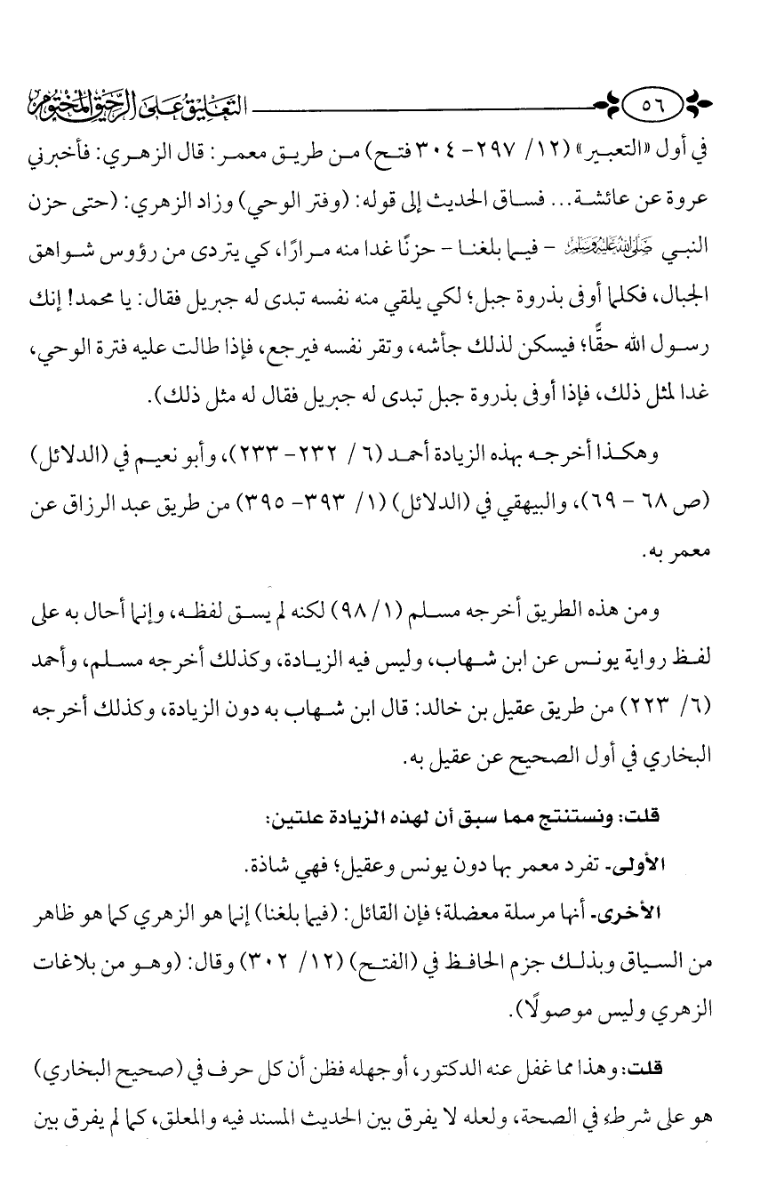 قلت: وهذا مما غفل عنه الدكتور، أوجهله فظن أن كل حرف في (صحيح البخاري) هو على شرطه في الصحة، ولعله لا يفرق بين الحديث المسند فيه والمعلق، كما لم يفرق بين