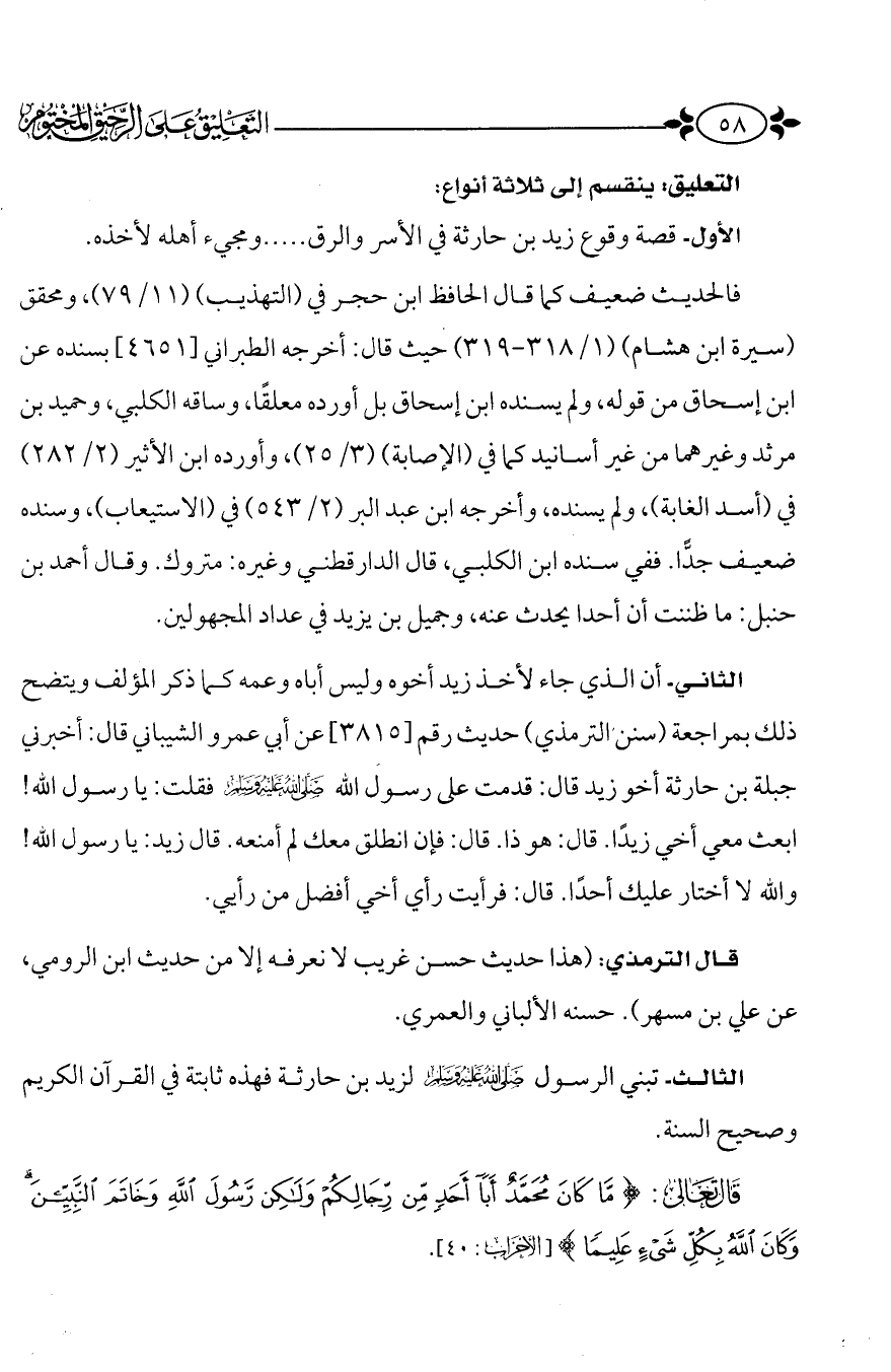 الثاني: أن الذي جاء لأخذ زيد أخوه وليس أباه وعمه كما ذكر المؤلف ويتضح ذلك بمراجعة سنن الترمذي حديث رقم (3815) عن أبي عمرو الشيباني قال: أخبرني جبلة بن حارثة أخو زيد قال: قدمت على رسول الله - صَلَّى اللَّهُ عَلَيْهِ وَسَلَّمَ - فقلت: يا رسول الله! ابعث معي أخي زيداً. قال: هو ذا. قال: فإن انطلق معك لم أمنعه. قال زيد: يا رسول الله! والله لا أختار عليك أحداً. قال: فرأيت رأي أخي أفضل من رأيي.