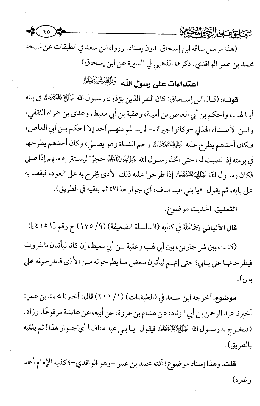 قوله: (قال ابن إسحاق: كان النفر الذين يؤذون رسول الله - صَلَّى اللَّهُ عَلَيْهِ وَسَلَّمَ - في بيته أبا لهب، والحكم بن أبي العاص بن أمية، وعقبة بن أبي معيط، وعدى بن حمراء الثقفي، وابن الأصداء الهذلي - وكانوا جيرانه - لم يسلم منهم أحد إلا الحكم بن أبي العاص، فكان أحدهم يطرح عليه - صَلَّى اللَّهُ عَلَيْهِ وَسَلَّمَ - رحم الشاة وهو يصلي، وكان أحدهم يطرحها في برمته إذا نصبت له، حتى اتخذ رسول الله - صَلَّى اللَّهُ عَلَيْهِ وَسَلَّمَ - حجرًا ليستتر به منهم إذا صلى فكان رسول الله - صَلَّى اللَّهُ عَلَيْهِ وَسَلَّمَ - إذا طرحوا عليه ذلك الأذى يخرج به على العود، فيقف به على بابه، ثم يقول: (يا بني عبد مناف، أي جوار هذا؟) ثم يلقيه في الطريق).