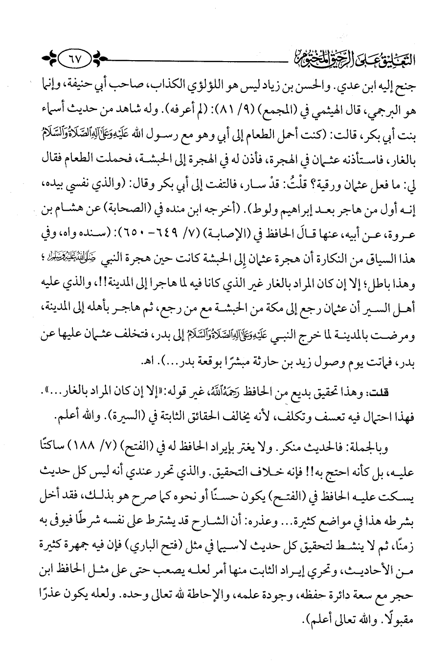 جنح إليه ابن عدي. والحسن بن زياد ليس هو اللؤلؤي الكذاب، صاحب أبي حنيفة، وإنما هو البرجمي، قال الهيثمي في (المجمع) (9/ 81): (لم أعرفه). وله شاهد من حديث أسماء بنت أبي بكر، قالت: (كنت أحمل الطعام إلى أبي وهو مع رسول الله - صلى الله عليه وآله وسلم - بالغار، فاستأذنه عثمان في الهجرة، فأذن له في الهجرة إلى الحبشة، فحملت الطعام فقال لي: ما فعل عثمان ورقية؟ قلْتُ: قدْ سار، فالتفت إلى أبي بكر وقال: (والذي نفسي بيده، إنه أول من هاجر بعد إبراهيم ولوط). (أخرجه ابن منده في (الصحابة) عن هشام بن عروة، عن أبيه، عنها قالَ الحافظ في (الإصابة) (7/ 649 - 650): (سنده واه، وفي هذا السياق من النكارة أن هجرة عثمان إِلى الحبشة كانت حين هجرة النبي - صَلَّى اللَّهُ عَلَيْهِ وَسَلَّمَ -؛ وهذا باطل؛ إلا أن كان المراد بالغار غير الذي كانا فيه لما هاجرا إلى المدينة!!، والذي عليه أهل السير أن عثمان رجع إلى مكة من الحبشة مع من رجع، ثم هاجر بأهله إلى المدينة، ومرضت بالمدينة لما خرج النبي - صلى الله عليه وآله وسلم - إلى بدر، فتخلف عثمان عليها عن بدر، فماتت يوم وصول زيد بن حارثة مبشراً بوقعة بدر ...). أهـ.