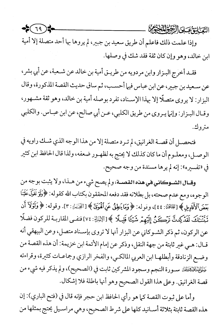 وقال الشوكاني في هذه القصة: ولم يصح شيء من هذا، ولا يثبت بوجه من الوجوه، ومع عدم صحته، بل بطلانه فقد دفعه المحققون بكتاب الله كقوله: {وَلَوْ تَقَوَّلَ عَلَيْنَا بَعْضَ الْأَقَاوِيلِ} [الحاقة: 44] وقوله: {وَمَا يَنطِقُ عَنِ الْهَوَى} [النجم: 3]. وقوله: {وَلَوْلاَ أَن ثَبَّتْنَاكَ لَقَدْ كِدتَّ تَرْكَنُ إِلَيْهِمْ شَيْئًا قَلِيلاً} [الإسراء: 74] فنفي المقاربة للركون فضلاً عن الركون، ثم ذكر الشوكاني عن البزار أنها لا تروى بإسناد متصل، وعن البيهقي أنه قال: هي غير ثابتة من جهة النقل، وذكر عن إمام الأئمة ابن خزيمة: أن هذه القصة من وضع الزنادقة وأبطلها ابن العربي المالكي، والفخر الرازي وجماعات كثيرة، وقراءته - صَلَّى اللَّهُ عَلَيْهِ وَسَلَّمَ - سورة النجم وسجود المشركين ثابت في الصحيح، ولم يذكر فيه شيء من قصة الغرانيق. وعلى هذا القول الصحيح وهو أنها باطلة فلا إشكال.
