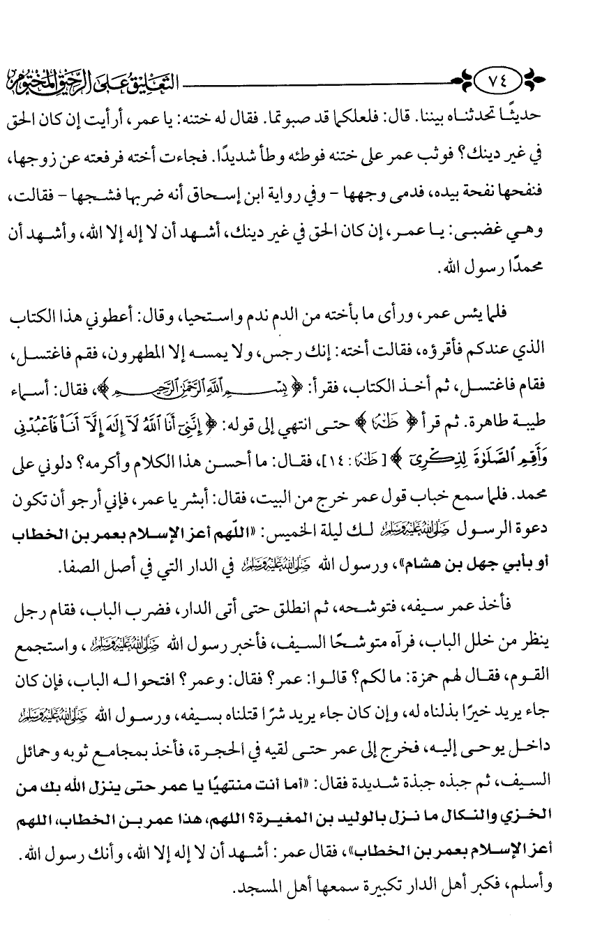 فلما يئس عمر، ورأى ما بأخته من الدم ندم واستحيا، وقال: أعطوني هذا الكتاب الذي عندكم فأقرؤه، فقالت أخته: إنك رجس، ولا يمسه إلا المطهرون، فقم فاغتسل، فقام فاغتسل، ثم أخذ الكتاب، فقرأ: {بِسْمِ اللَّهِ الرَّحْمَنِ الرَّحِيمِ} فقال: أسماء طيبة طاهرة. ثم قرأ [طه] حتى انتهي إلى قوله: {إِنَّنِي أَنَا اللَّهُ لَا إِلَهَ إِلَّا أَنَا فَاعْبُدْنِي وَأَقِمِ الصَّلَاةَ لِذِكْرِي} [طه: 14] فقال: ما أحسن هذا الكلام وأكرمه؟ دلوني على محمد. فلما سمع خباب قول عمر خرج من البيت، فقال: أبشر يا عمر، فإني أرجو أن تكون دعوة الرسول - صَلَّى اللَّهُ عَلَيْهِ وَسَلَّمَ - لك ليلة الخميس: (اللهم أعز الإسلام بعمر بن الخطاب أو بأبي جهل بن هشام)، ورسول الله - صَلَّى اللَّهُ عَلَيْهِ وَسَلَّمَ - في الدار التي في أصل الصفا.