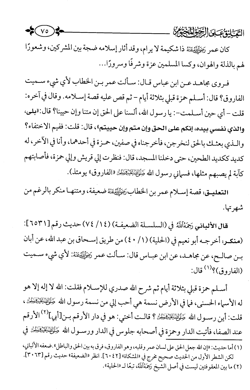 التعليق: قصة إسلام عمر بن الخطاب - رضي الله عنه - ضعيفة، ومتنها منكر بالرغم من شهرتها.