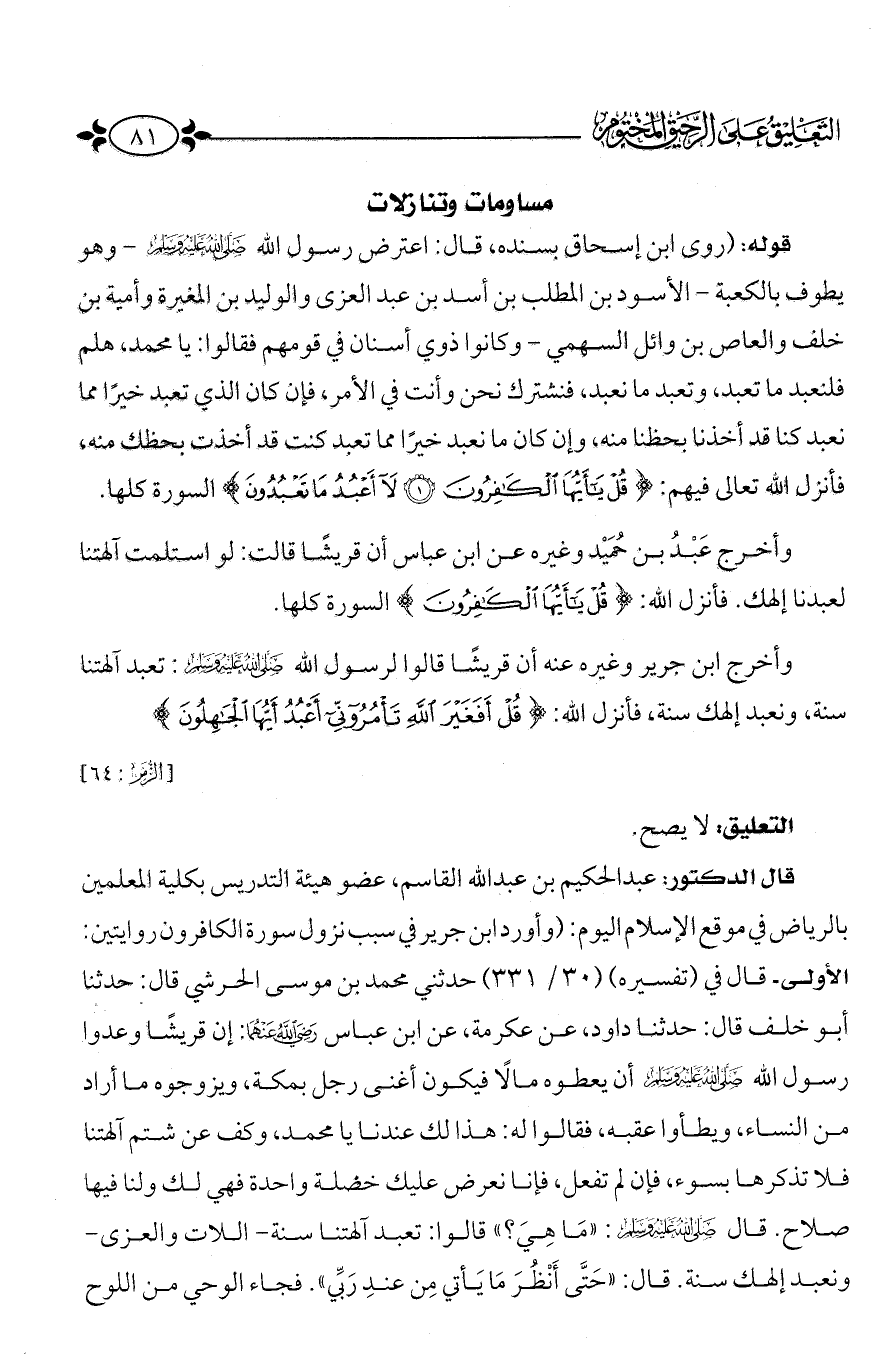 قال الدكتور: عبدالحكيم بن عبد الله القاسم، عضو هيئة التدريس بكلية المعلمين بالرياض في موقع الإسلام اليوم: (وأورد ابن جرير في سبب نزول سورة الكافرون روايتين: