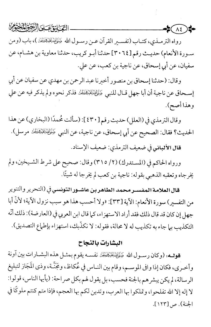 رواه الترمذي، كتاب تفسير القرآن عن رسول الله - صَلَّى اللَّهُ عَلَيْهِ وَسَلَّمَ -، باب (ومن سورة الأنعام) حديث رقم (3064) حدثنا أبو كريب، حدثنا معاوية بن هشام، عن سفيان، عن أبي إسحاق، عن ناجية بن كعب، عن علي.