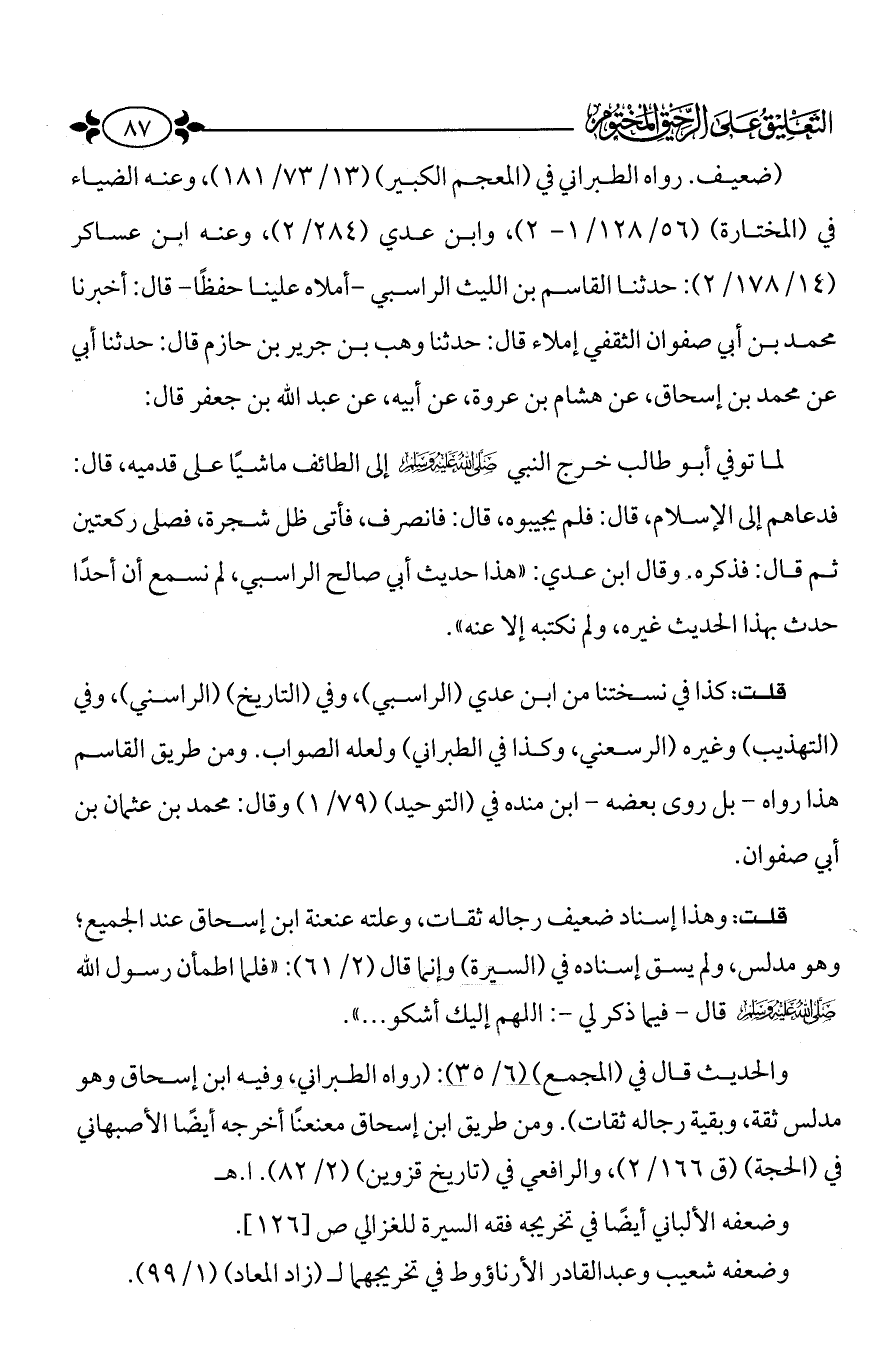 لما توفي أبو طالب خرج النبي - صَلَّى اللَّهُ عَلَيْهِ وَسَلَّمَ - إلى الطائف ماشياً على قدميه، قال: فدعاهم إلى الإسلام، قال: فلم يجيبوه، قال فانصرف، فأتى ظل شجرة، فصلى ركعتين ثم قال: فذكره. وقال ابن عدي: