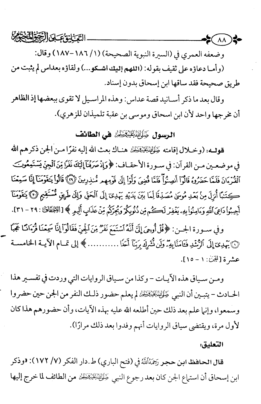 قوله: (وخلال إقامته - صَلَّى اللَّهُ عَلَيْهِ وَسَلَّمَ - هناك بعث الله إليه نفرًا من الجن ذكرهم الله في موضعين من القرآن: في سورة الأحقاف: {وَإِذْ صَرَفْنَا إِلَيْكَ نَفَرًا مِّنَ الْجِنِّ يَسْتَمِعُونَ الْقُرْآنَ فَلَمَّا حَضَرُوهُ قَالُوا أَنصِتُوا فَلَمَّا قُضِيَ وَلَّوْا إِلَى قَوْمِهِم مُّنذِرِينَ * قَالُوا يَا قَوْمَنَا إِنَّا سَمِعْنَا كِتَابًا أُنزِلَ مِن بَعْدِ مُوسَى مُصَدِّقًا لِّمَا بَيْنَ يَدَيْهِ يَهْدِي إِلَى الْحَقِّ وَإِلَى طَرِيقٍ مُّسْتَقِيمٍ * يَا قَوْمَنَا أَجِيبُوا دَاعِيَ اللَّهِ وَآمِنُوا بِهِ يَغْفِرْ لَكُم مِّن ذُنُوبِكُمْ وَيُجِرْكُم مِّنْ عَذَابٍ أَلِيمٍ} [الأحقاف: 29: 31].